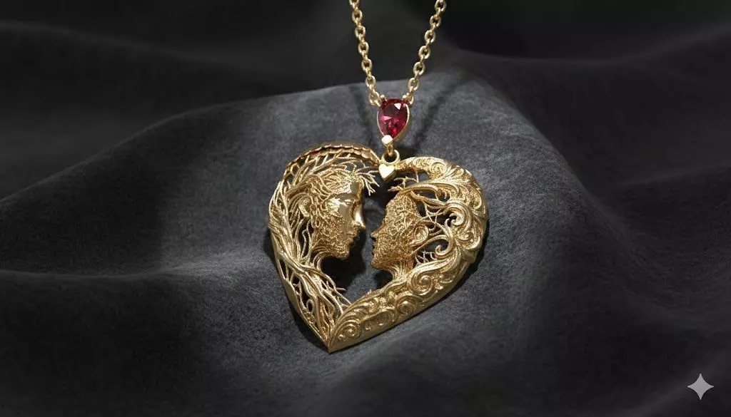 A poetic symbol of love, Destined Love captures two souls intertwined within a golden heart. Flowing filigree weaves their profiles together like vines of passion, crowned with a deep crimson gemstone that glows like a heartbeat. A timeless tribute to romance, devotion, and the magnetic pull between kindred spirits.