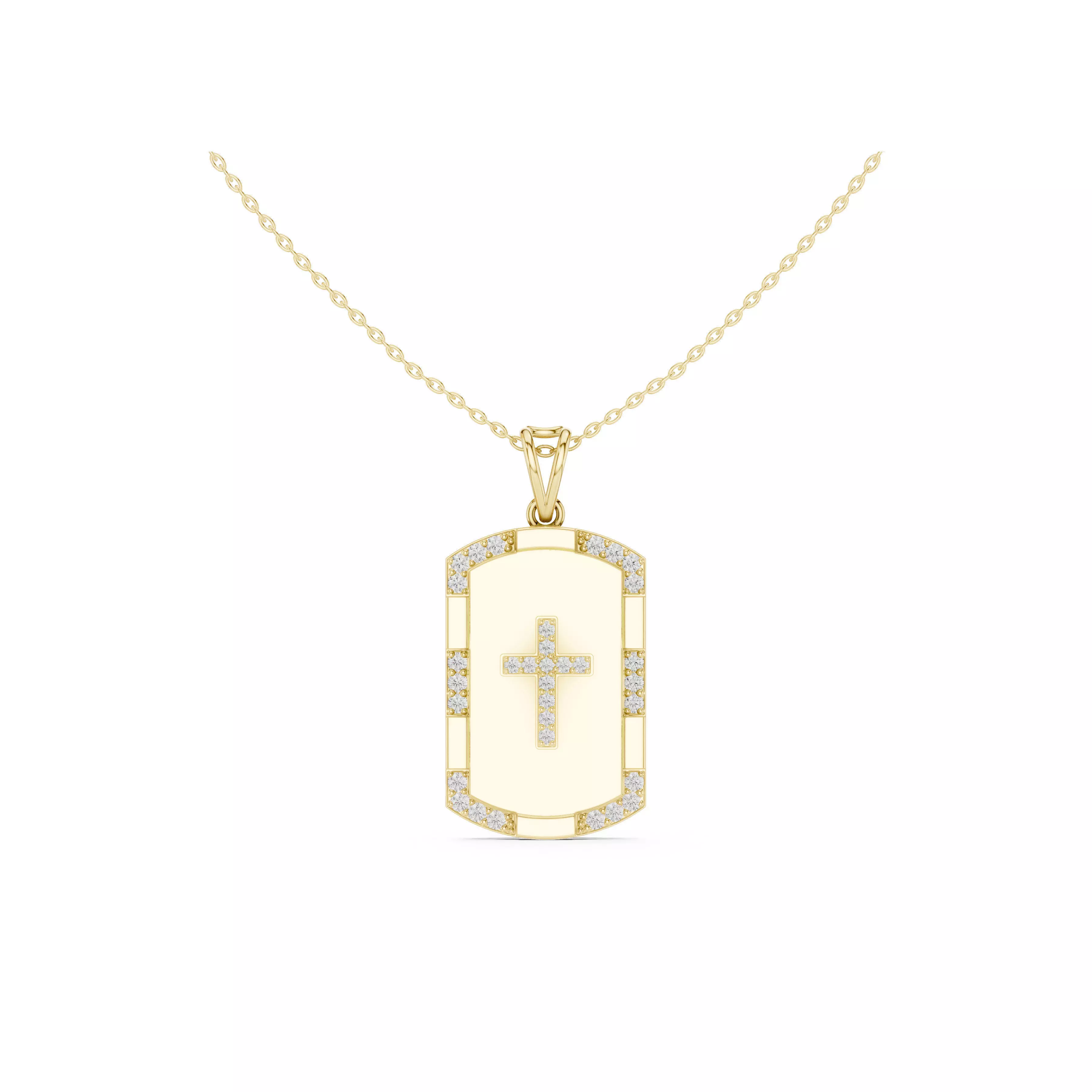 This rectangular dog tag style pendant features a raised diamond cross centerpiece set into a smooth polished surface. The outer border is accented with precision-set diamonds, creating a refined frame that enhances brilliance while maintaining a clean, sophisticated look.