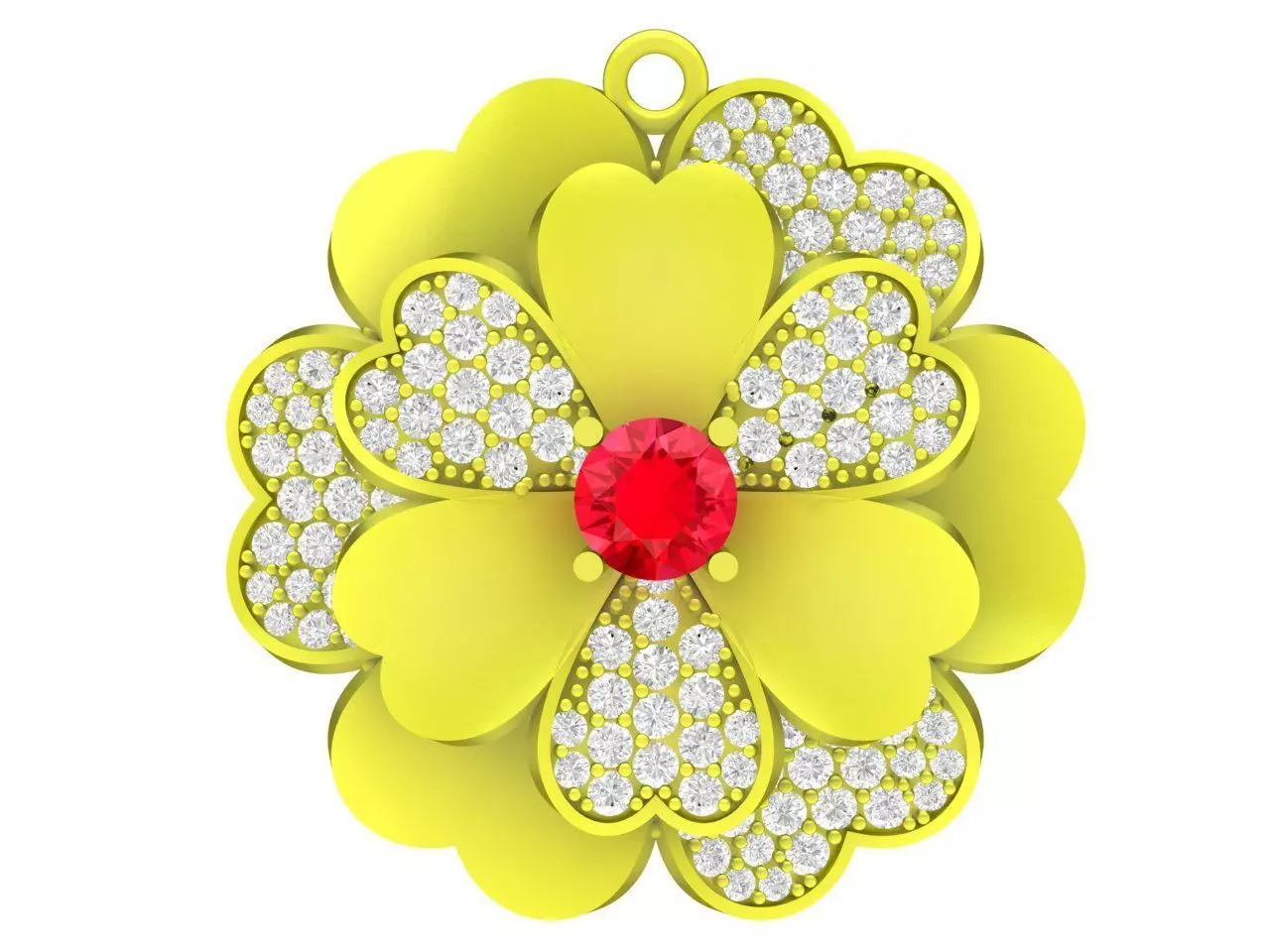 This luxury four leaf clover diamond flower pendant is a refined jewelry design inspired by symbols of luck, harmony, and prosperity. The pendant features layered clover-shaped petals with a soft floral arrangement, combining polished metal surfaces with pavé-set stones for added brilliance. A round center stone highlights the design and creates a balanced focal point.