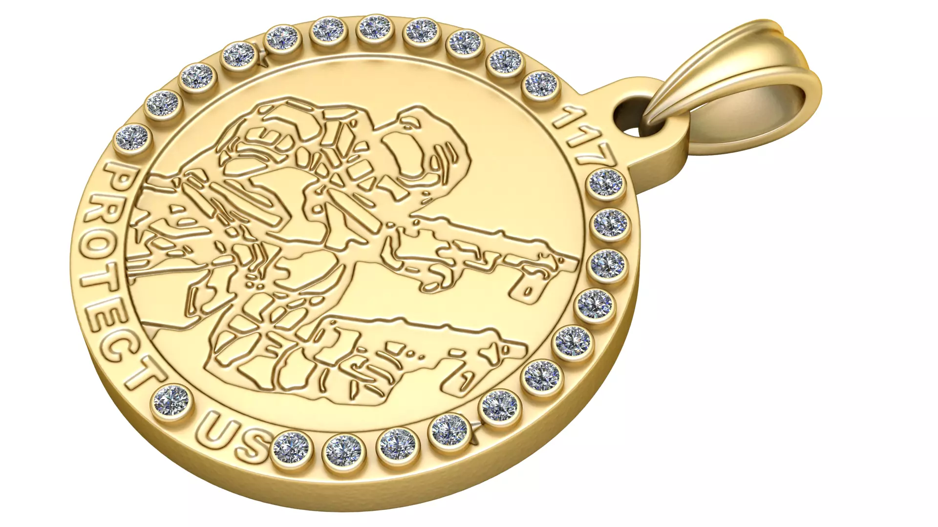 This powerful and meaningful Protect US Military Pendant is designed to honor bravery, sacrifice, and patriotism. The round gold pendant features a detailed engraving of a modern soldier in combat stance, symbolizing strength, courage, and dedication to protecting the nation. The words “PROTECT US” are engraved along the border, reinforcing the message of protection and service.