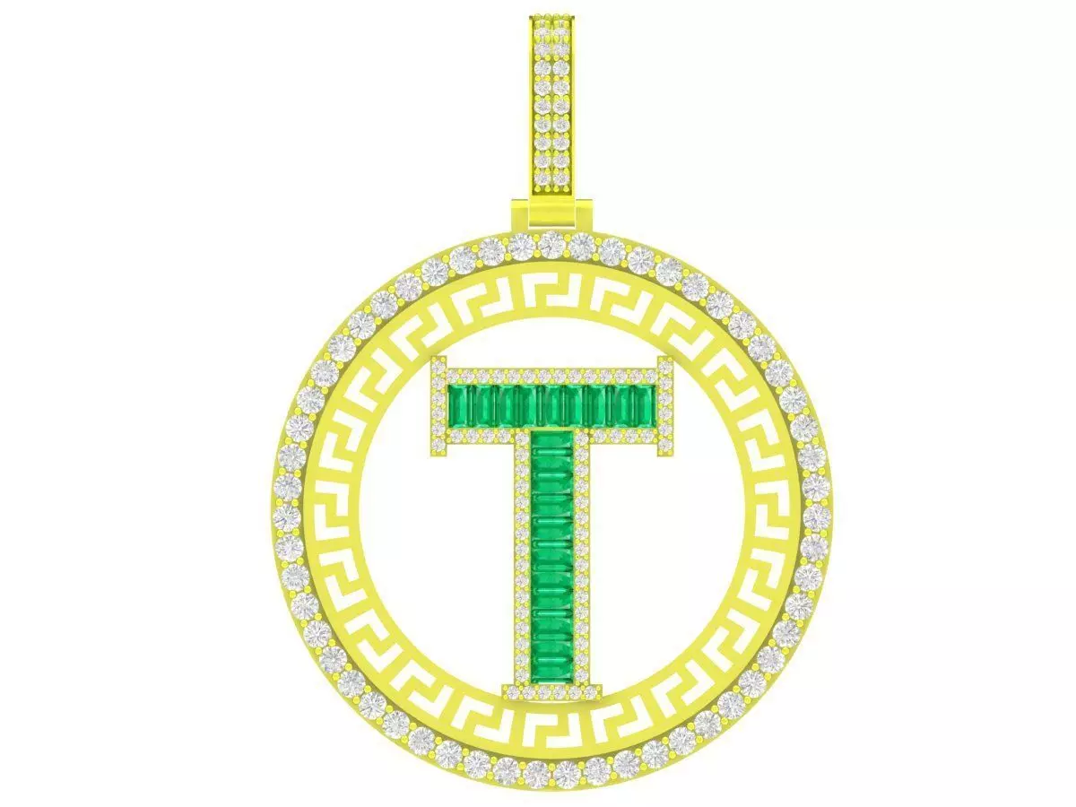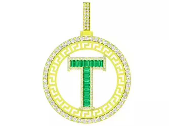 This luxury letter T pendant 3D model features a bold circular design combined with a classic alphabet letter centerpiece. The surrounding frame is decorated with a geometric pattern, creating a strong visual balance between modern style and symbolic meaning.