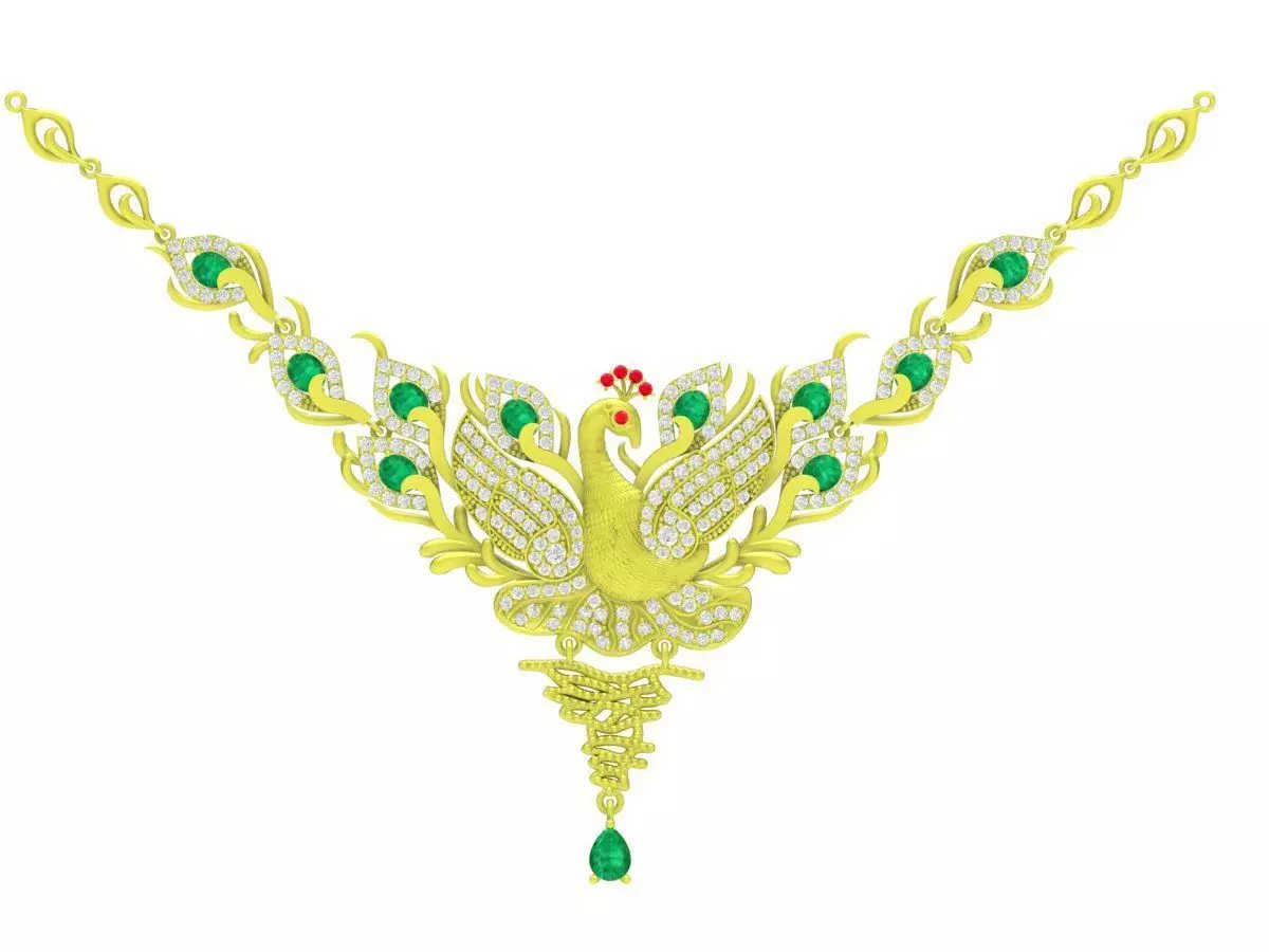 The necklace is designed in a bib-style layout, with integrated chain links and gemstone settings along the wings. A central dangling drop element adds movement and elegance to the piece, enhancing its visual impact when worn. The model supports multiple gemstone types and sizes, allowing flexible customization for different collections.