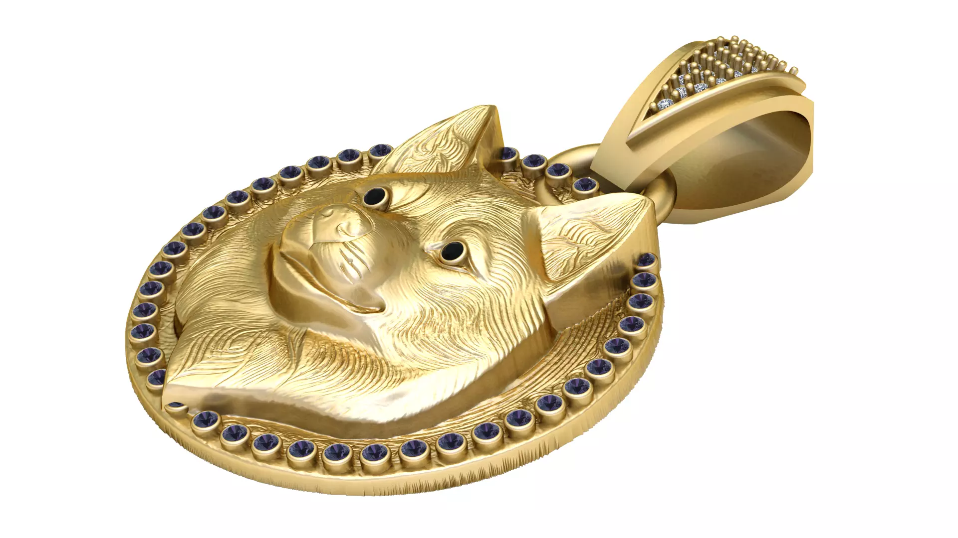 This elegant gold pendant showcases a finely sculpted 3D dog head, likely inspired by a husky or similar breed, rendered with remarkable detail to highlight the texture of the fur and expressive facial features. Set within a circular medallion, the piece is surrounded by a continuous halo of deep violet gemstones, which contrast beautifully against the warm yellow gold. The dog's eyes are accented with black gemstone inlays, adding realism and emotional depth to the design. The bail is equally luxurious, featuring an architectural, angled form encrusted with white diamonds arranged on raised gold pegs, enhancing the pendant’s regal and modern appeal.