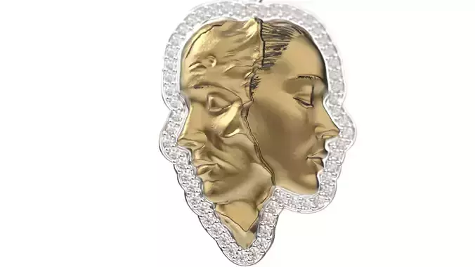 This unique pendant features two realistic human faces merged into a single form, symbolizing duality, inner conflict, or harmony between two souls. The design is framed with a diamond-setting border, creating a strong contrast between polished precious metal and detailed sculpted faces.
