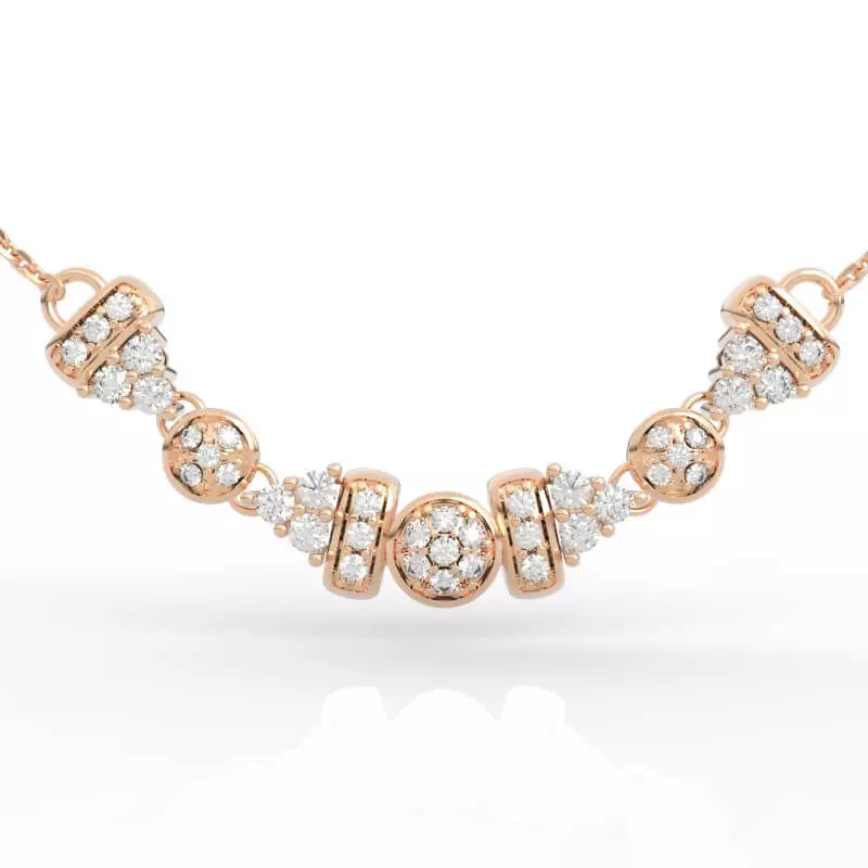 This stunning necklace is made up of interlocking circular and cylindrical elements, with each piece gleaming with diamonds. At the heart of the necklace lies a large round diamond flower setting, flanked by two symmetrical cylindrical diamond accents. Every unit is carefully connected through a delicate, yet sturdy link design, which forms a graceful curve that hugs the neckline. The diamonds are carefully set to create a mesmerizing sparkle, ensuring that each piece shines from every angle.