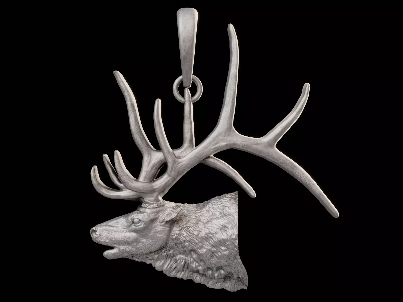 A detailed representation of an elk's head designed as a pendant. The intricate design captures the majestic presence of the elk, with a particular focus on the antlers, which are depicted with a realistic spread and branching structure. The antlers, with their natural curvature and texture, emphasize the strength and grandeur of the elk. The head is rendered with a lifelike portrayal of the elk’s features, including the eyes, snout, and fur texture, giving the model a dynamic and lifelike appearance.