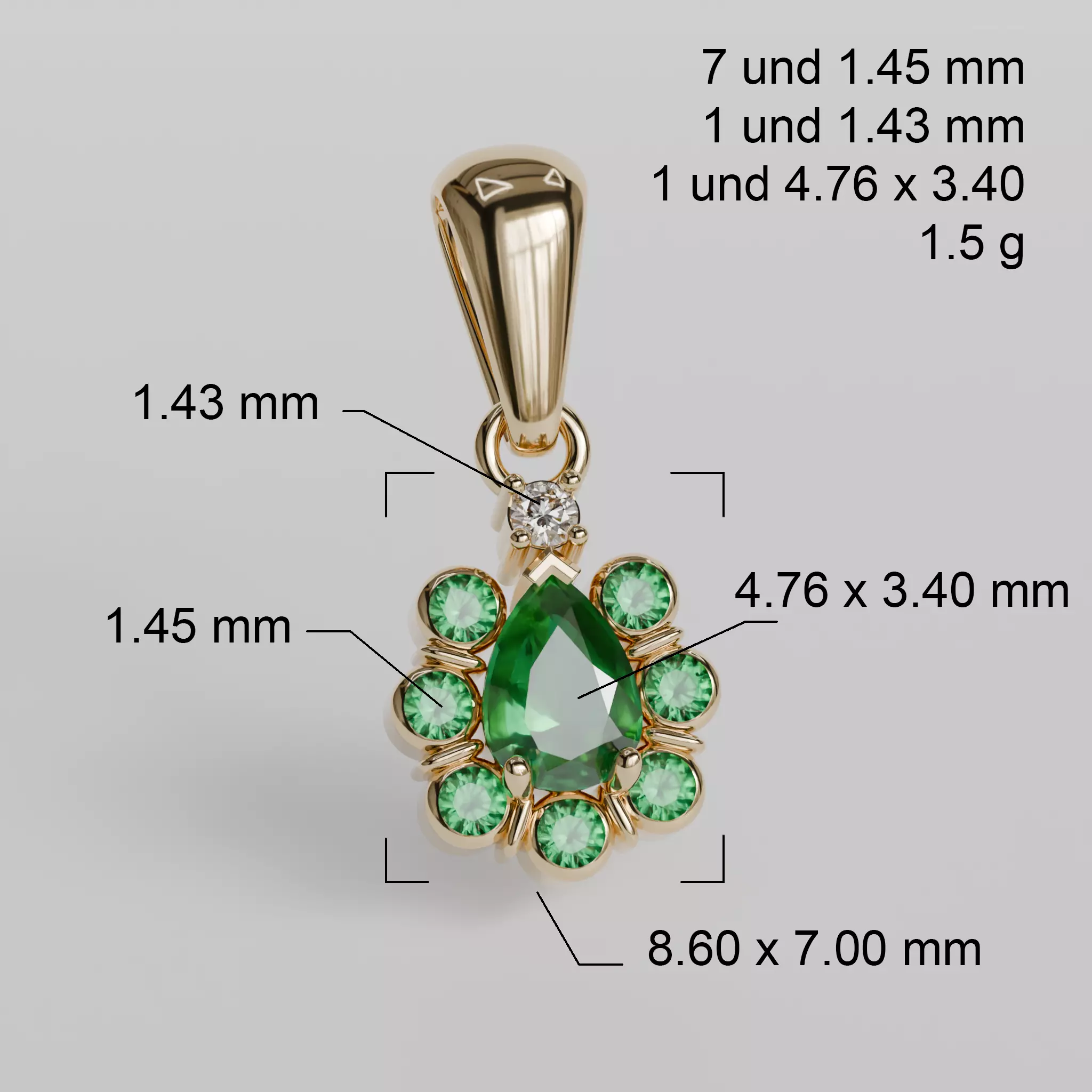 8.60 mm high by 7.00 mm wide7 cubic zirconia or diamond inlays, 1.45 mm in diameter1 inlay, 1.43 mm in diameter1 teardrop-cut stone, 4.76 x 3.40 mm