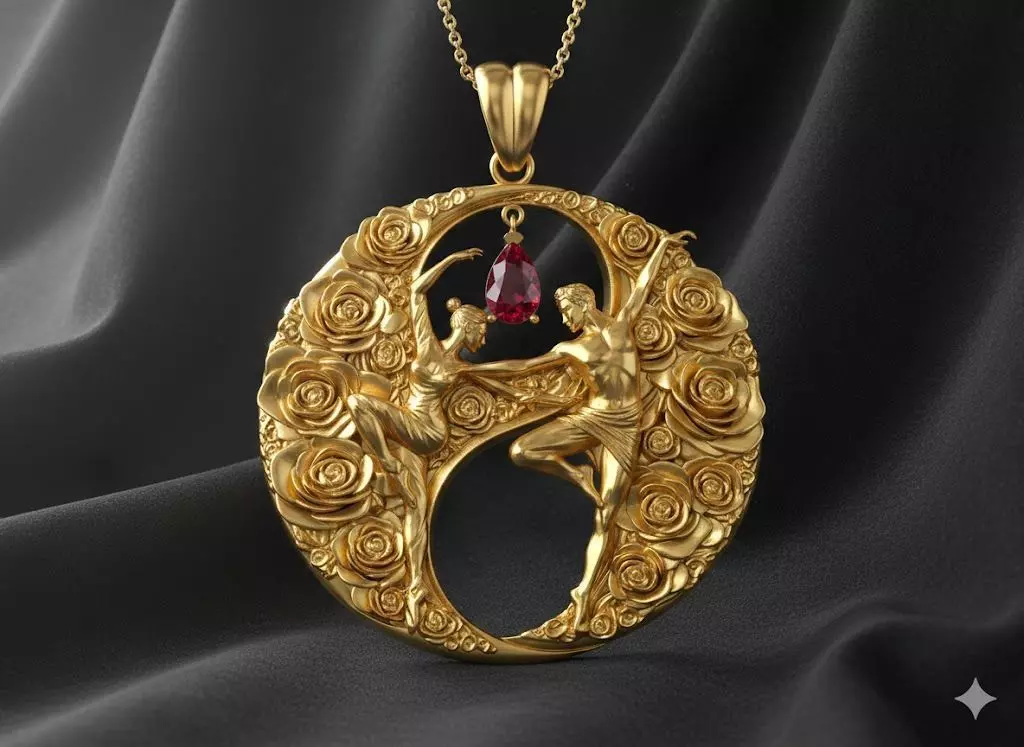 Forged in the warm glow of gold, this pendant captures the precise moment where two souls become one movement. Surrounded by a chaotic, beautiful thicket of sculpted roses, the central figures are locked in a dance that transcends time.