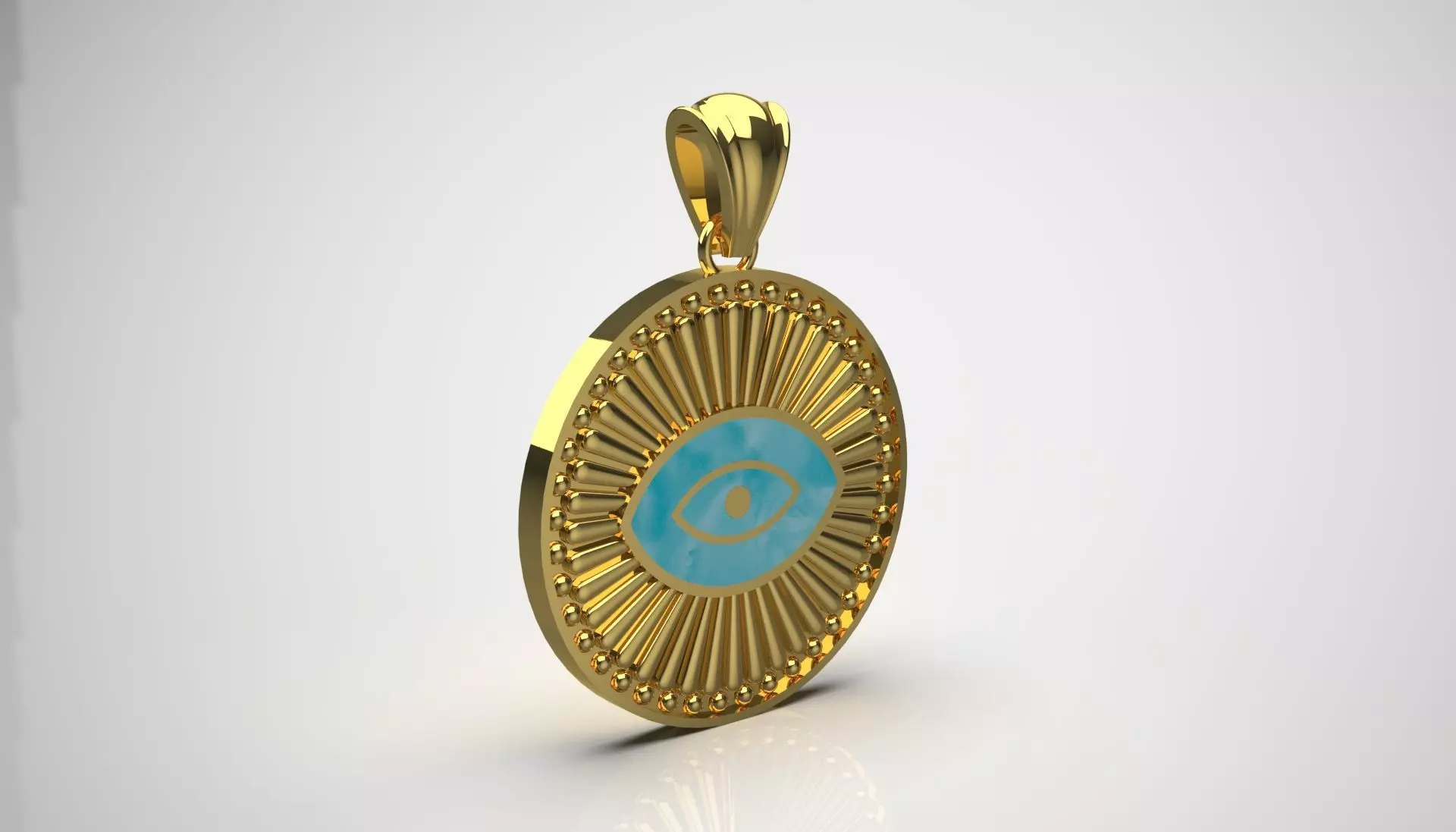Around the eye, this pendant features a textured pattern with long, sun-like rays that extend outward, adding a dynamic and energetic feel. Small gold beads are placed along the outer edge, contributing to the intricate detailing of the piece. The bow at the top is beautifully designed, making it hang beautifully when worn. Overall, this pendant combines symbolism with art, making it a fashionable piece.