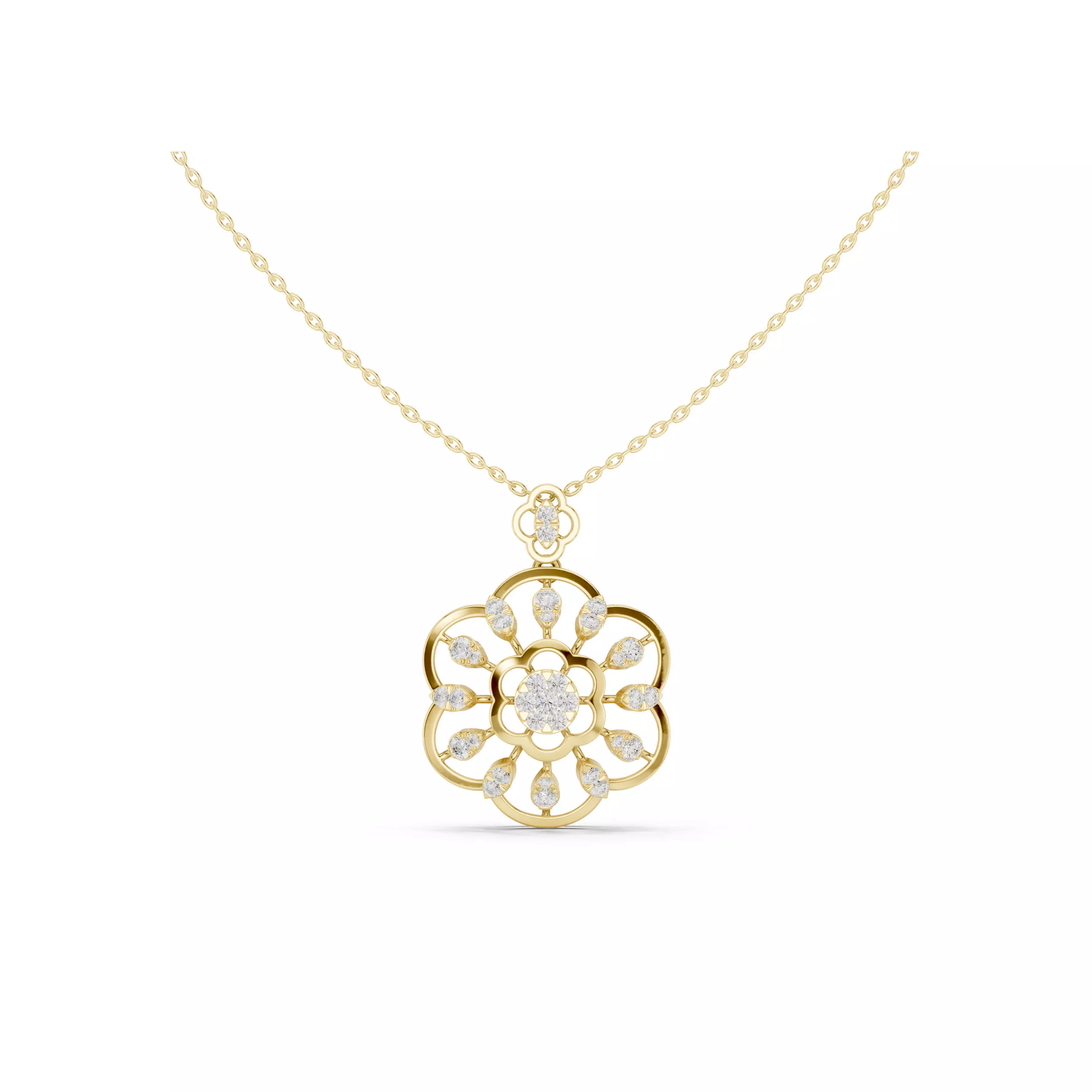 This openwork flower-inspired pendant features a brilliant round center stone surrounded by petal-shaped diamond accents arranged in a symmetrical bloom pattern. The flowing outer curves form a soft floral silhouette, creating a graceful balance between structure and delicacy.