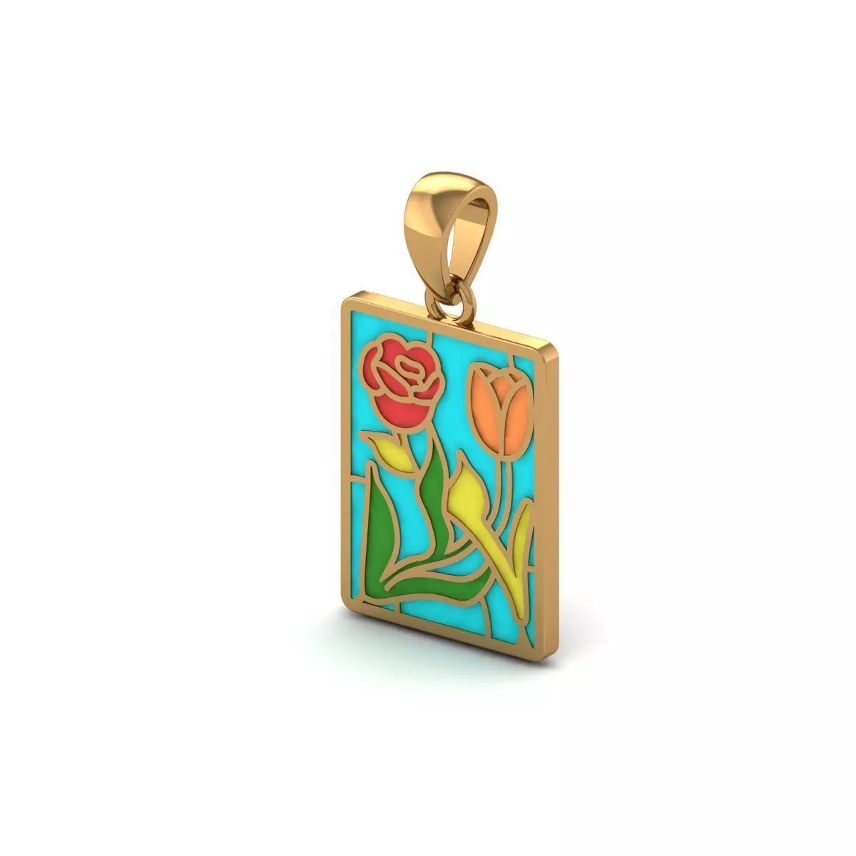This refined 3D CAD pendant design features an artistic floral composition enclosed within a clean rectangular gold frame. The rose and tulip motif is highlighted with vibrant enamel detailing over a turquoise background, creating a rich contrast against the polished 14KT Yellow Gold structure.