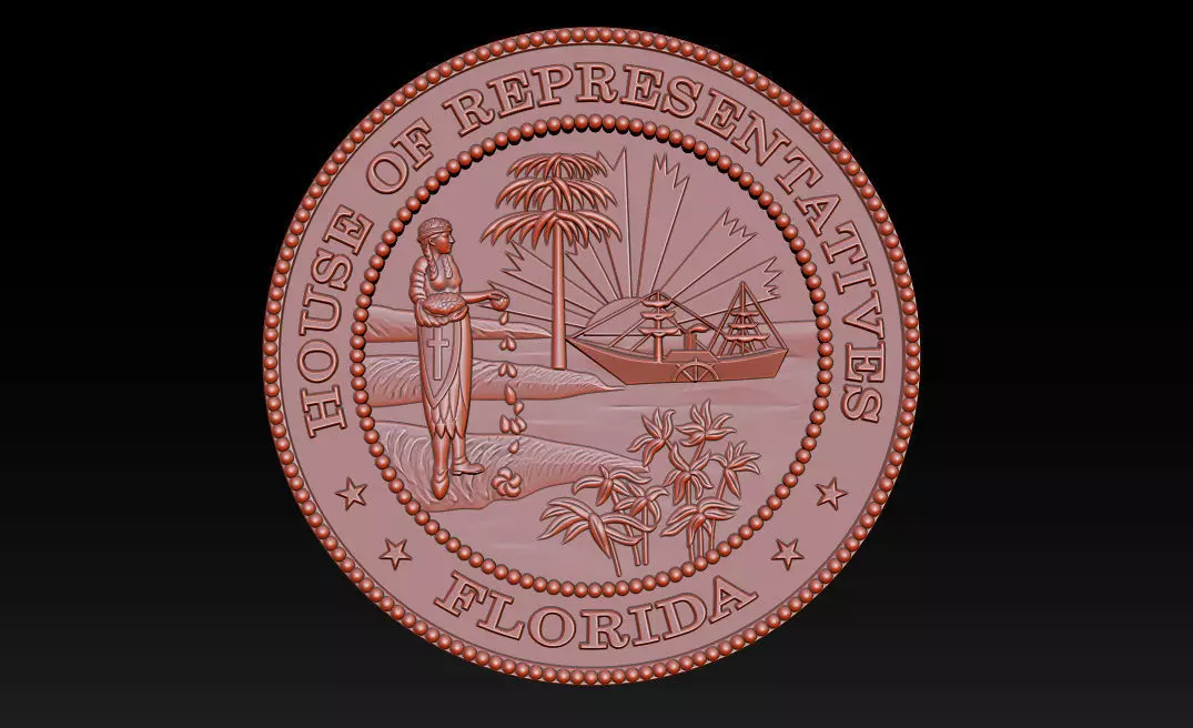 Premium 3D relief model of the Florida House of Representatives seal, designed for CNC carving, engraving, and jewelry applications. High detail, production-ready, and optimized for professional use.