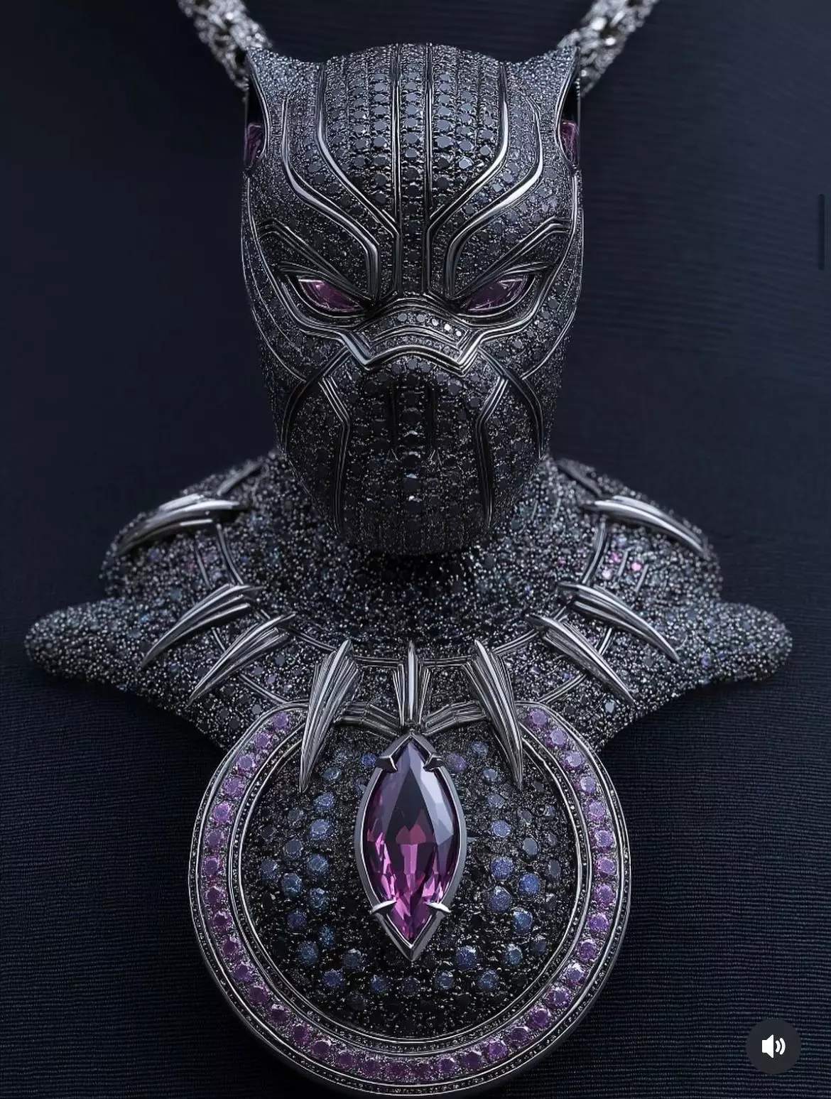 This Futuristic Panther Mask Medallion Pendant 3D model features a powerful panther-inspired mask design combined with a luxury round medallion. The piece showcases sharp contours, layered surface detailing, and a bold necklace-style composition that gives a high-end hip hop jewelry look. The central marquise stone setting and surrounding micro-stone areas make this design ideal for diamond or gemstone setting.