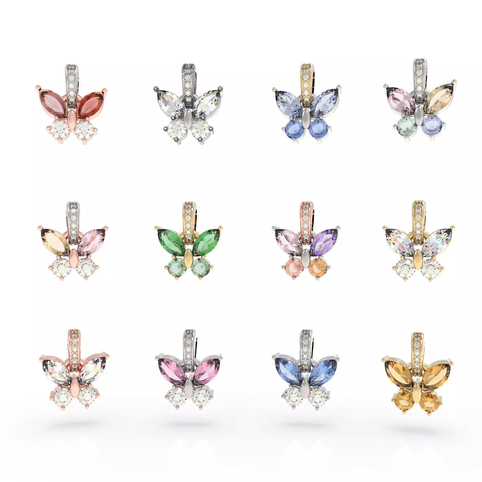 Butterfly pendant with a diamond-set bail and precise gemstone layout. Suitable for jewelry production, 3D printing, and rendering.