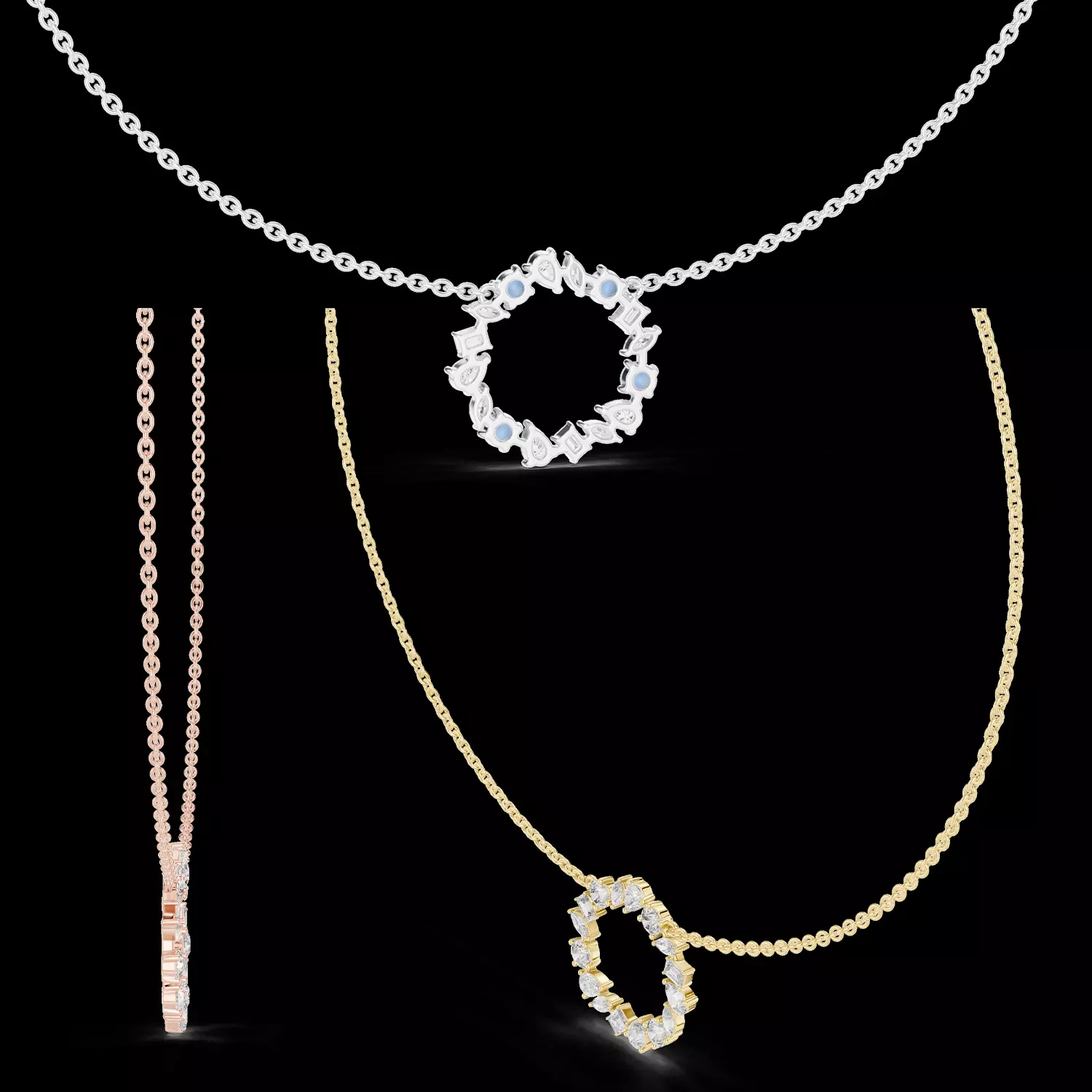 The pendant connects seamlessly to a fine link chain through a hidden top integration, ensuring natural alignment when worn. The side profile is engineered with precise stone seats and secure prong or bezel settings for production reliability and long-term durability.