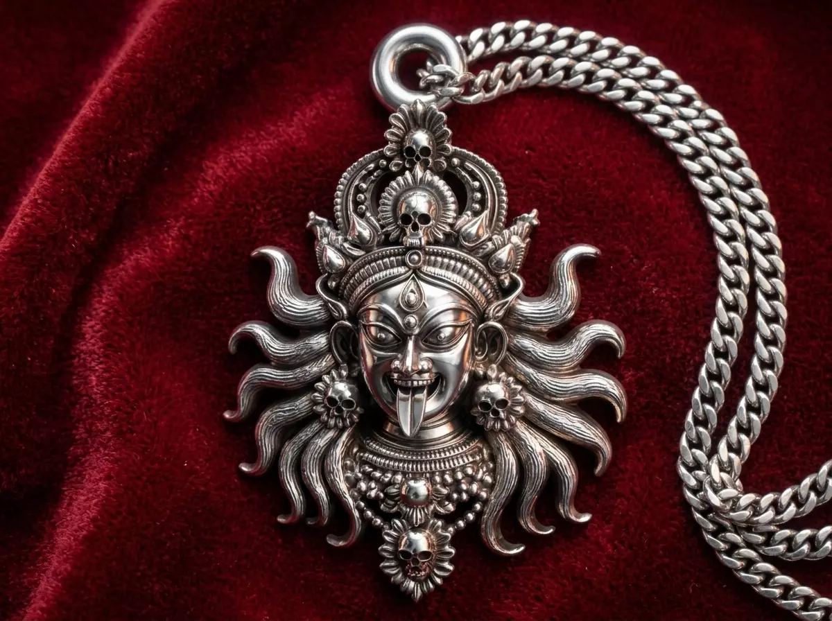 This pendant depicts Goddess Kali, one of the most powerful and revered deities in Hindu mythology. Kali represents transformation, protection, and the destruction of evil forces.