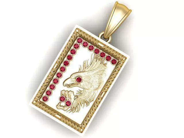 This luxury rectangular eagle pendant is crafted in high-polish gold with a bold and majestic eagle design engraved at the center. The eagle’s piercing eye and powerful claw are accented with vivid red gemstones, adding strength and character to the piece. A border of round-cut red stones frames the pendant, enhancing its brilliance and making it a statement accessory. With its rope-style edge and smooth finish, this pendant blends elegance, symbolism, and craftsmanship, making it perfect for those who value power, freedom, and prestige