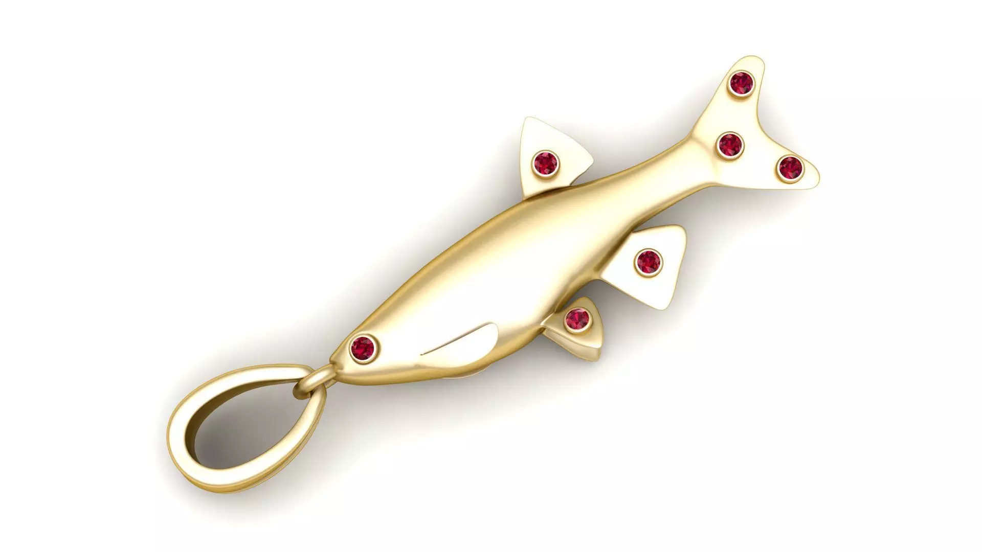 This sleek gold pendant is shaped like a streamlined fish, symbolizing grace, flow, and abundance. The minimalistic form is adorned with seven brilliant red gemstones — one as the eye and six accenting the fins and tail — adding vibrant detail and luxurious charm. Its polished finish gives it a smooth, elegant look, while the wide, secure bail ensures it can be worn comfortably on various chains. This pendant is a perfect blend of modern simplicity and symbolic elegance.