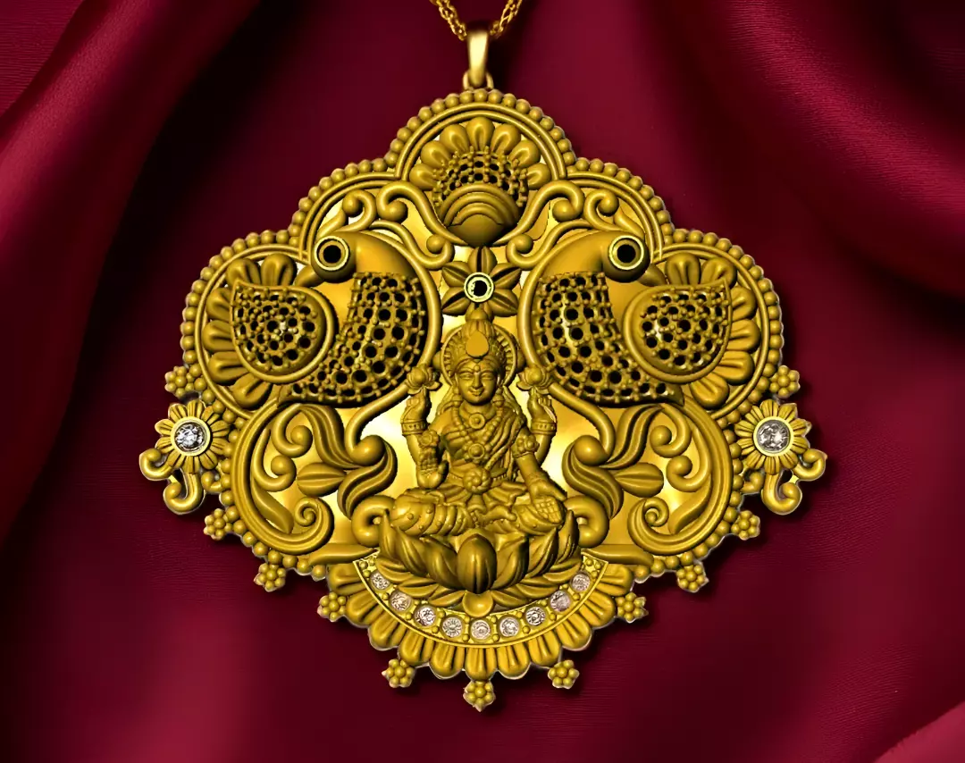 This exquisite 3D Goddess Pendant design is a premium, high-detail gold jewelry model created for professional jewelers, designers, and manufacturers. The pendant features a beautifully detailed goddess figure seated in a traditional posture, surrounded by ornate floral and peacock-inspired motifs, with precise gemstone placements to enhance its elegance. Crafted with exceptional accuracy, this model is suitable for CNC milling, lost-wax casting, and high-resolution 3D printing.