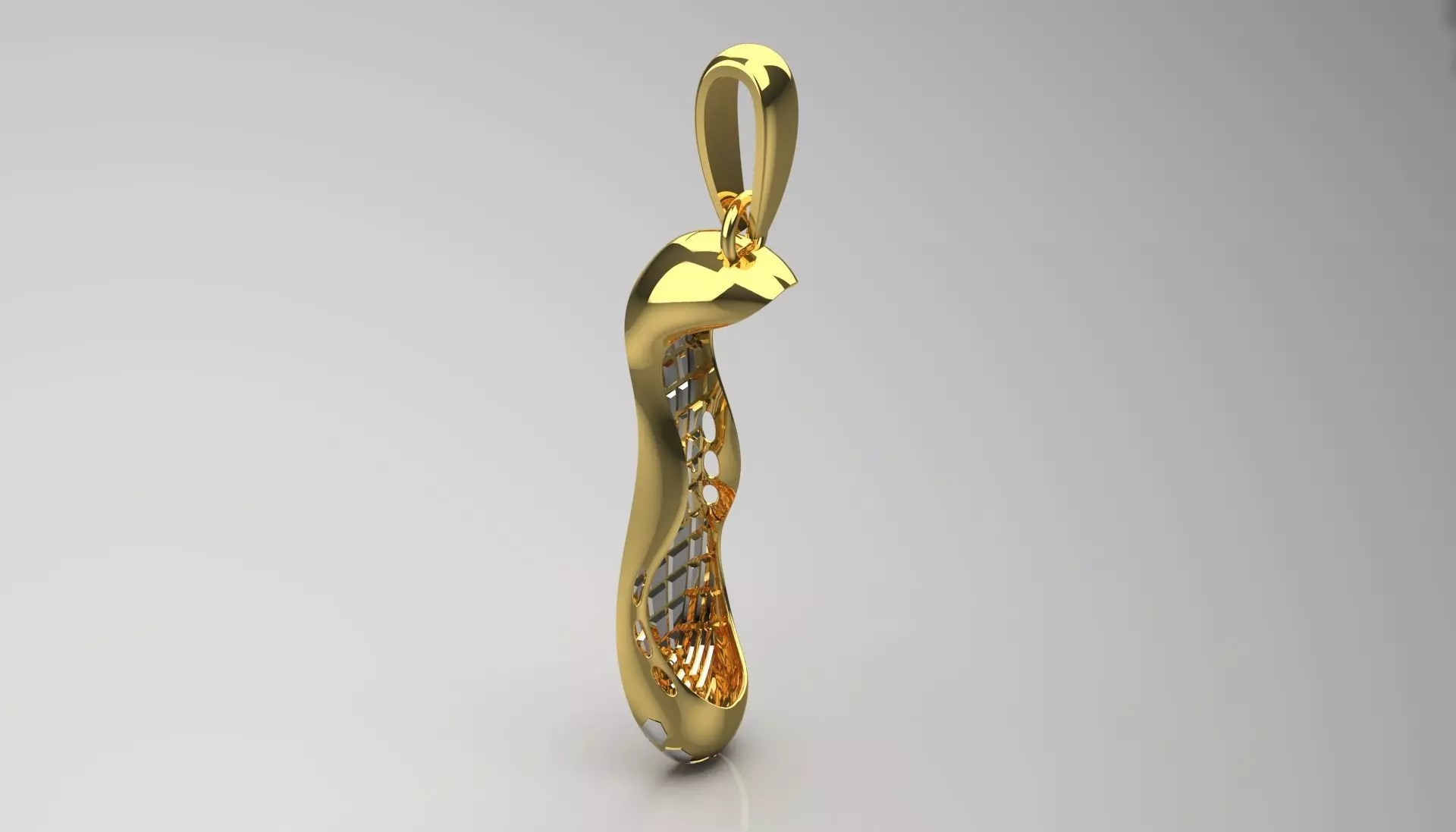 Interestingly, this pendant features an openwork design that exposes a lattice structure that adds depth and charm. The grid is made up of geometric openings that show off the shape of the shoe and create a striking contrast with the smooth sections. At the top, there is a polished bow for attaching to a chain or rope. Overall, the combination of the sleek lines of yellow gold and white gold creates an attractive shoe.