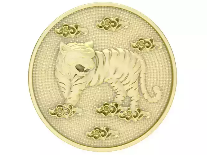 This luxury tiger zodiac coin pendant features a highly detailed 3D relief design with sharp engraving depth and smooth curvature transitions. The tiger is sculpted in a powerful walking pose with fine fur texture, cloud patterns, and a decorated background, making the piece ideal for both jewelry production and collectible coin manufacturing. The edges are modeled with precise thickness to ensure durability during casting and polishing.