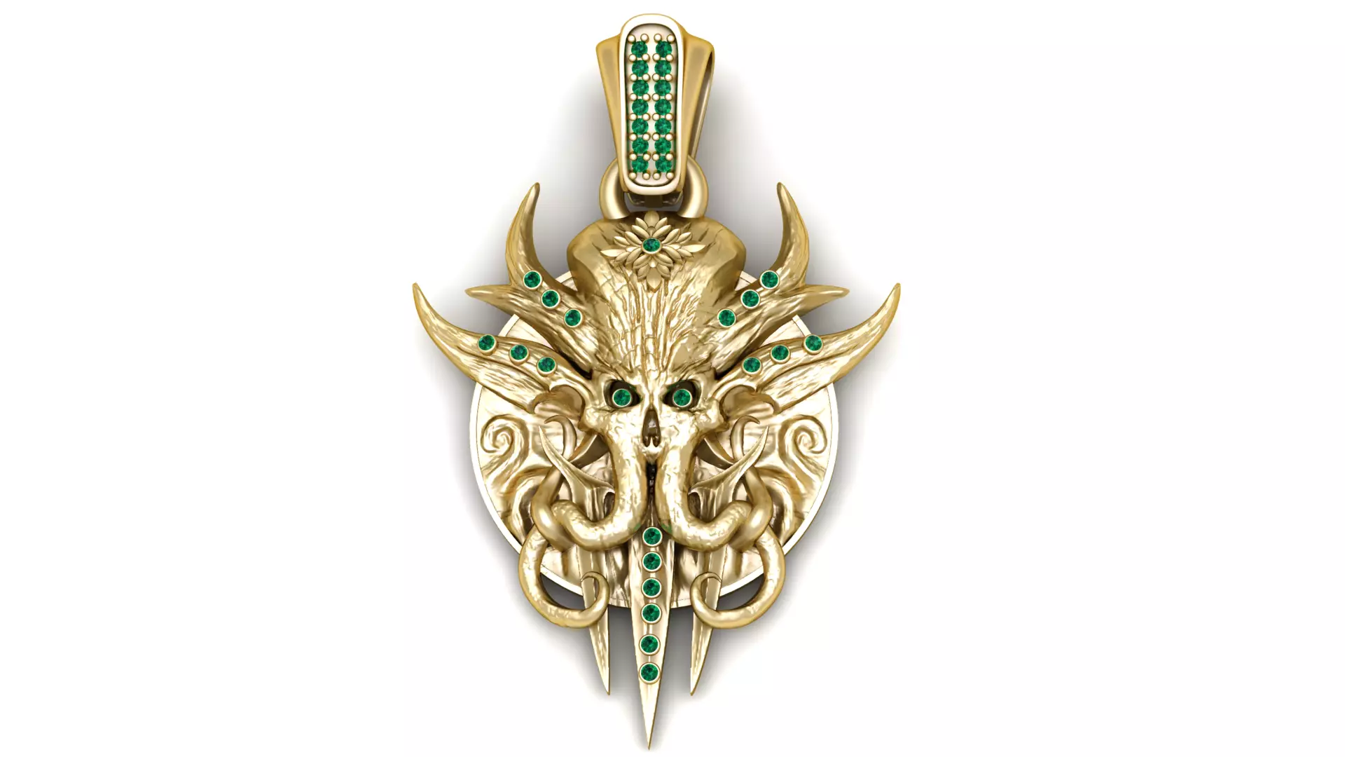A dramatic and highly detailed golden kraken pendant inspired by legendary sea monsters and ancient maritime myths. This intricate 3D jewelry model features a powerful kraken head with flowing tentacles, sculpted textures, and dynamic motion, all layered over an ornate circular backing. Vivid emerald gemstone settings accent the eyes, horns, tentacles, and bail, adding depth, contrast, and luxury brilliance. Designed as a bold statement piece, this pendant symbolizes dominance, mystery, and the untamed power of the ocean, making it ideal for high-end gold casting, fantasy collections, and elite nautical jewelry lines.