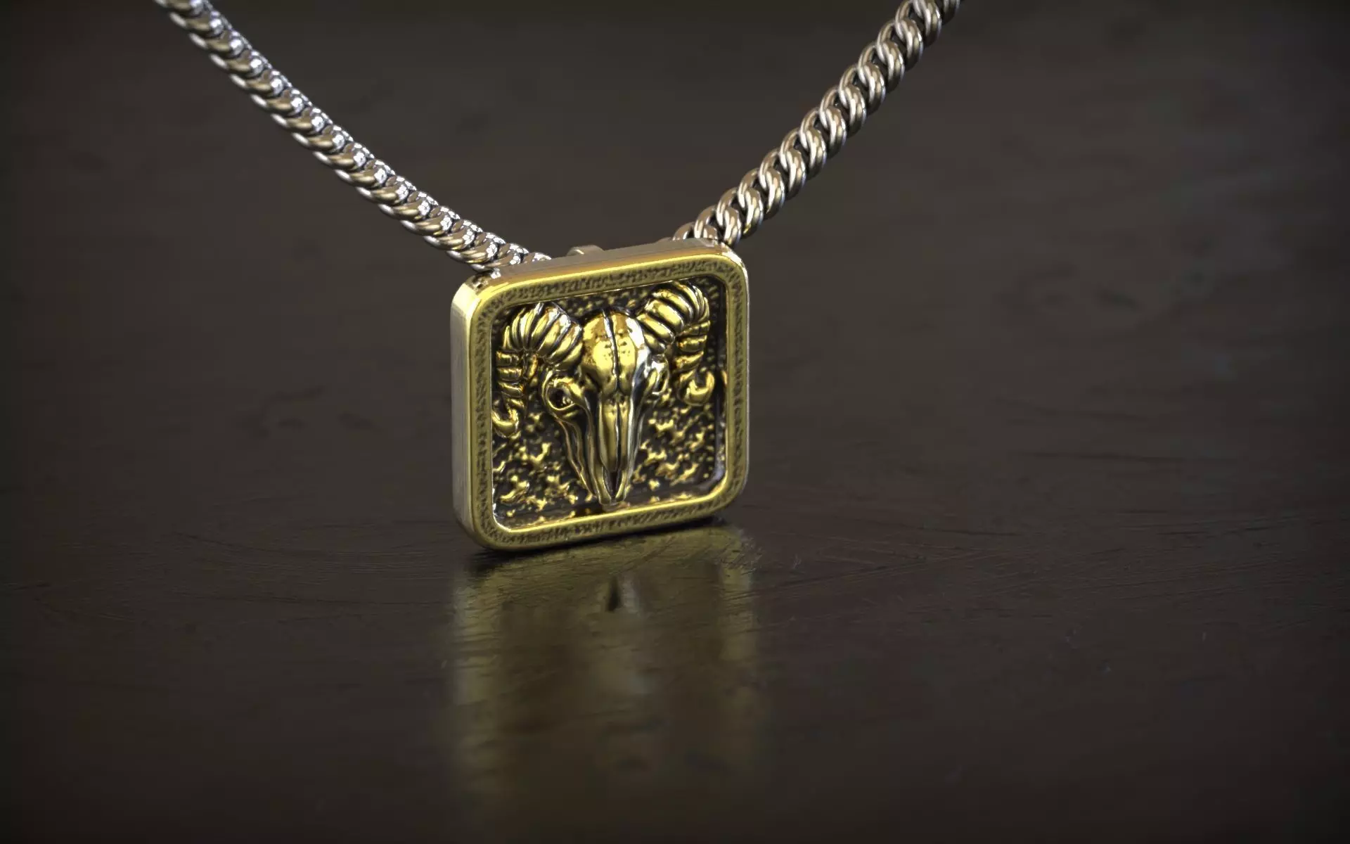 Framed Ram Skull Pendant - This is a professionally sculpted, high-fidelity 3D printable pendant featuring a realistic ram skull set within a rugged, textured square frame. Blending gothic aesthetics with symbolic Aries imagery, this relief-style piece is designed for high-impact statement jewelry. The detailed horn textures and weathered background are optimized to catch light and shadows beautifully after polishing.