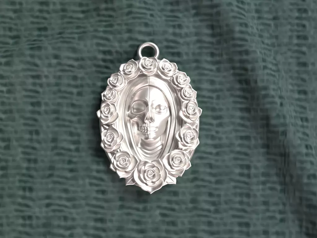 High-quality gothic pendant featuring a symbolic memento mori relief — a female face merged with a skull, framed by a wreath of sculpted roses. The design blends romantic gothic aesthetics with classic vanitas symbolism, creating a striking and timeless statement piece.