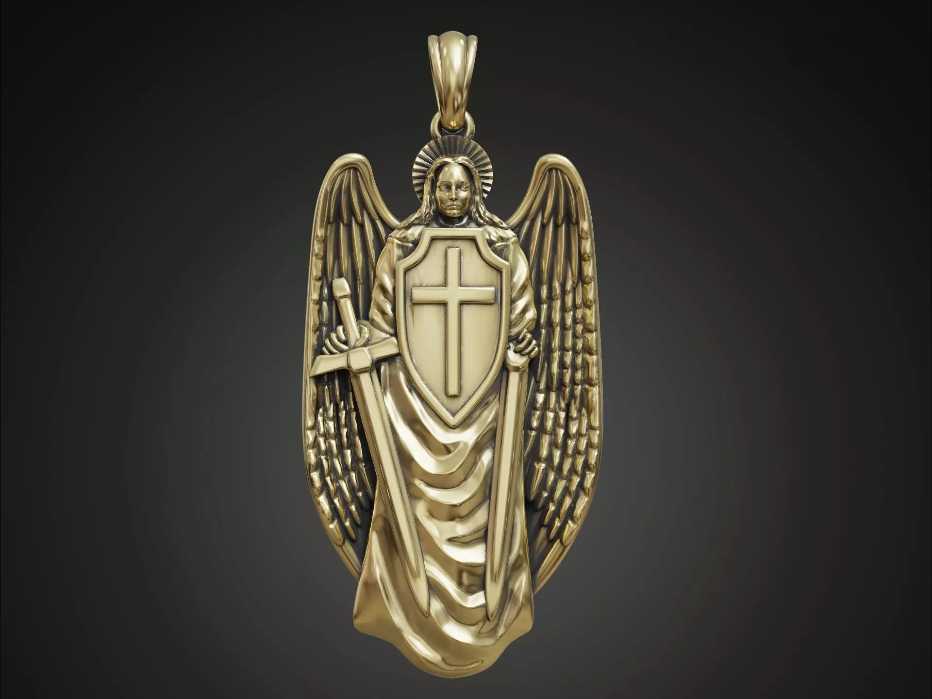 A pendant designed in the shape of an angel with outstretched wings and a halo. It holds a shield emblazoned with a cross. This piece of jewelry combines religious symbolism with artistic metalwork.