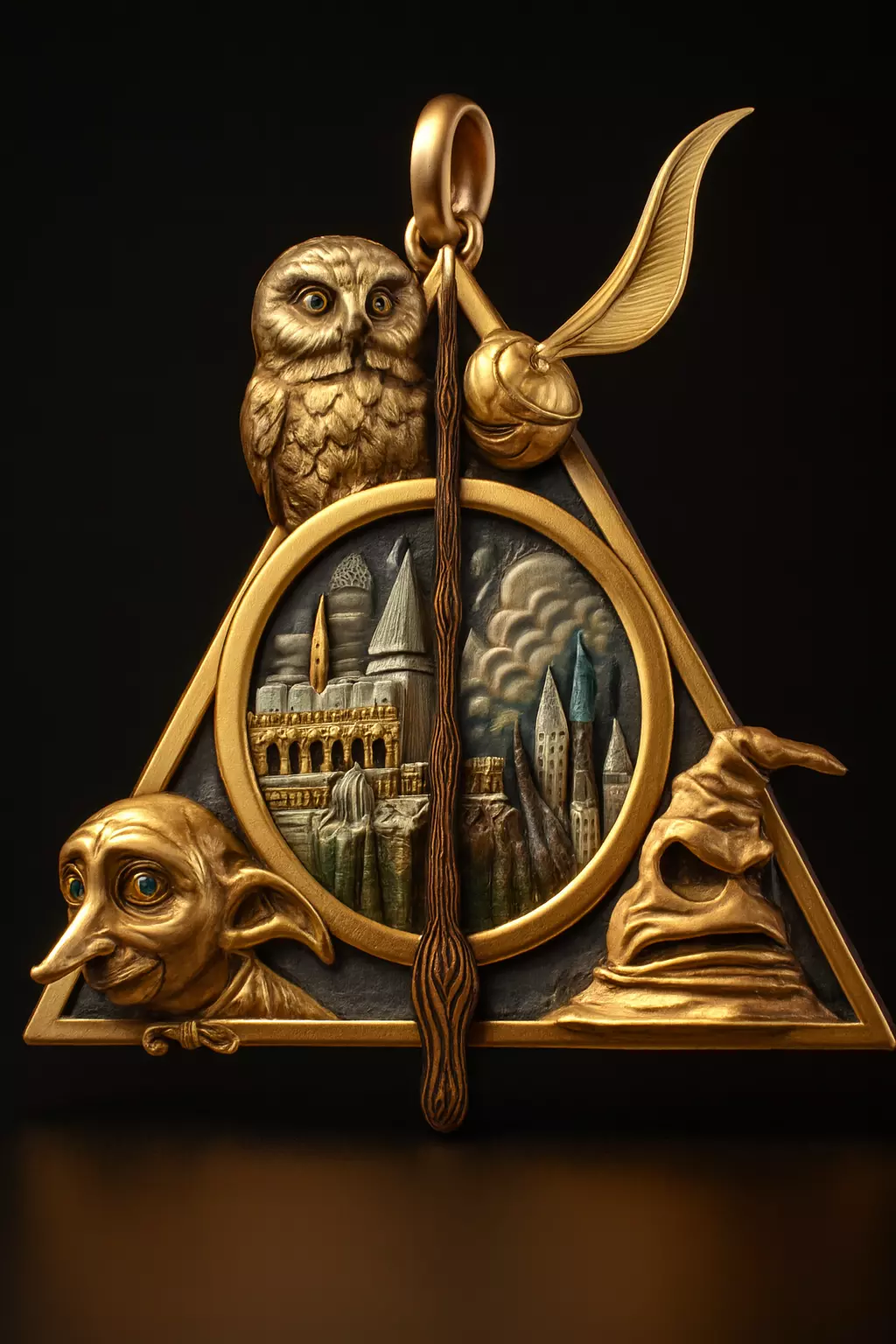 Bring the magic to life with this intricate Wizarding World Tribute 3D Model. This commemorative medallion is a labor of love for fantasy fans, featuring a highly detailed owl perched atop the Deathly Hallows symbol, flanked by a faithful house elf and the wise sorting hat. A golden snitch and a textured wand complete this symmetrical masterpiece. Every element is sculpted with deep relief to ensure that even the smallest details, like feather textures and hat folds, translate perfectly into precious metal.