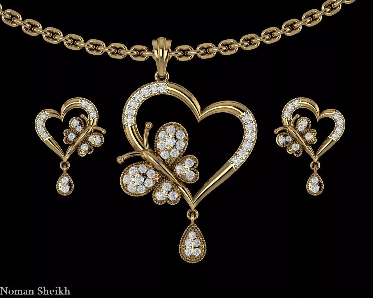 Elegant butterfly pendant and earring set. This eye-catching jewelry set features a delicate butterfly pendant and matching earrings, all crafted in gold. The pendant features a sparkling stone in the center of the butterfly's body, adding a touch of glamour.