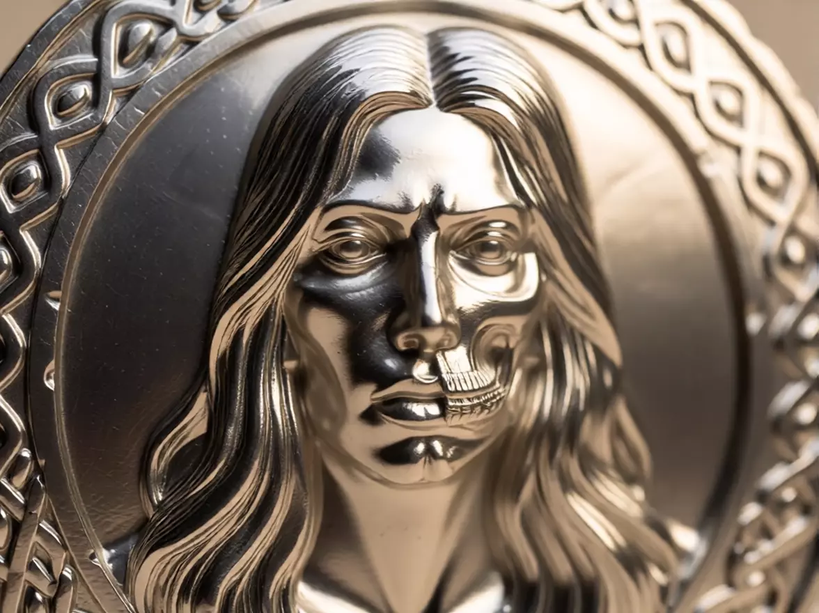 The medallion features a detailed relief portrait of Hel, the powerful goddess from Norse mythology who rules the realm of the dead. The design shows the traditional dual nature of Hel — half living woman and half skull, symbolizing the balance between life and death.