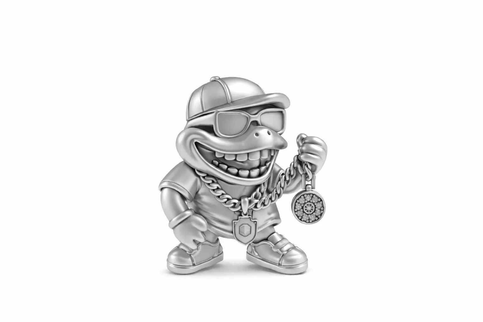 This Hip Hop Gold Cartoon Rapper Pendant 3D Model features a stylish urban character wearing a cap, sunglasses, sneakers, and a thick rope chain. The figure is holding a round iced medallion, giving it a luxury hip hop jewelry look. The exaggerated smile and bold proportions make it perfect for eye-catching custom pendants.