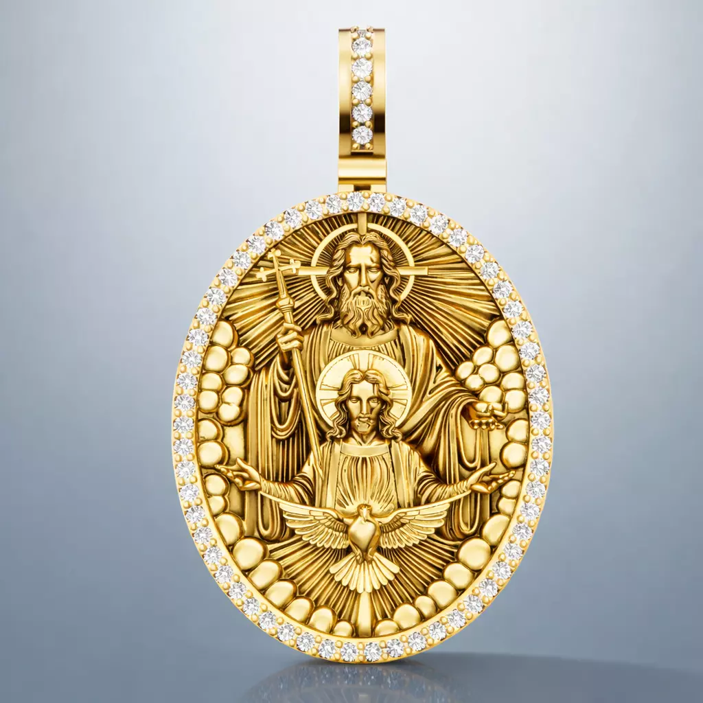 Representation of the Holy Trinity (God, Jesus, Holy Spirit)Detailed and expressive sculptClean, watertight geometryCorrect scale for jewelry manufacturingReady for casting and 3D printingProfessional jewelry CAD model