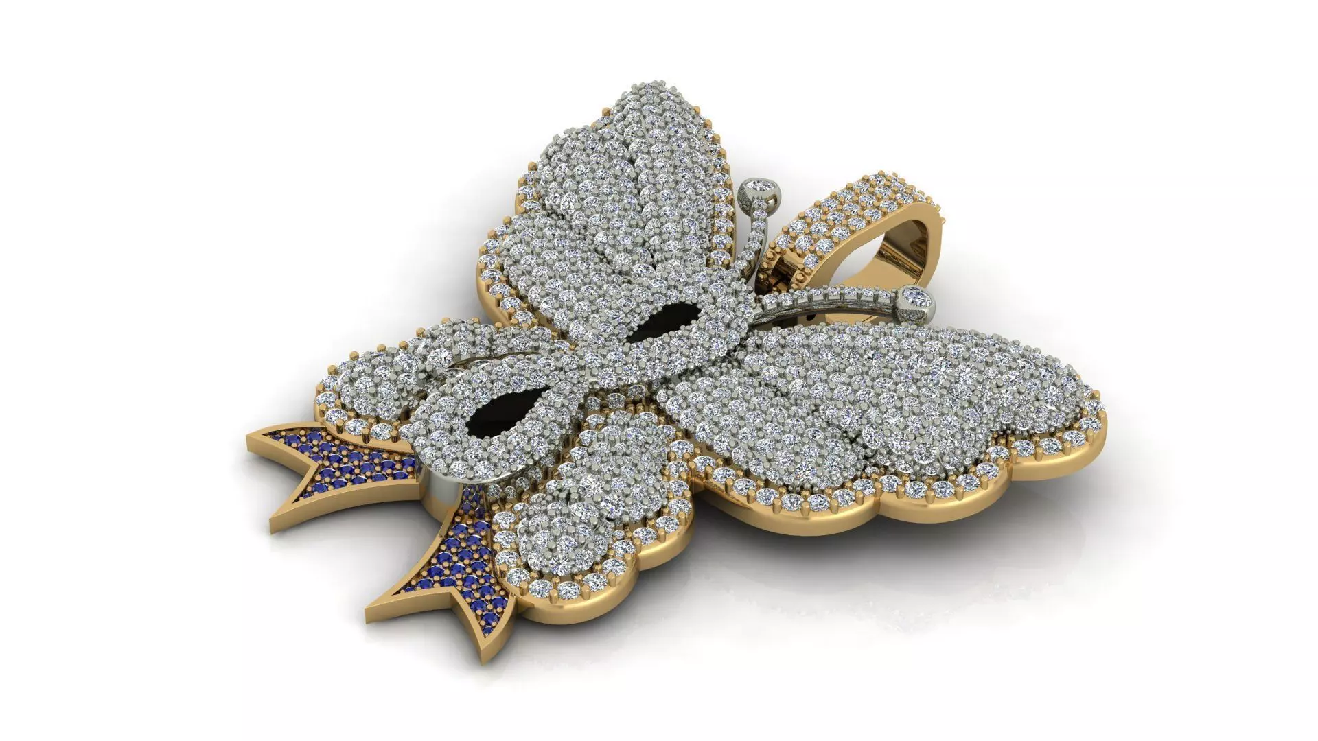 Intricate butterfly shape with a central ribbon/figure-eight element and a decorative bow at the bottom, heavily set with gemstones.