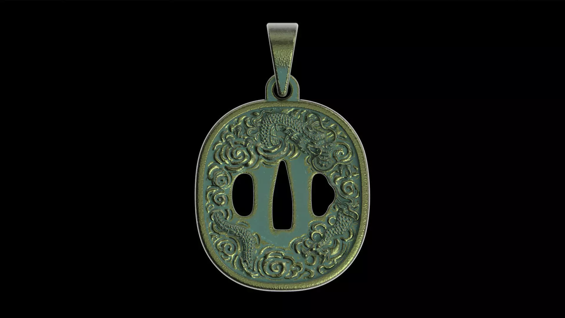 This pendant model was inspired by Japanese sword mountings designs. Tsubas are round or square-ish (usually) guards at the end of the grip of bladed Japanese weapons that are usually decorated with elegant finishes and considered now as a collector's items. The craftsmanship of making tsuba in Japan was a hereditary craft. Bushido's codex denounced samurai wearing rings, earrings, and other jewelry. However, the samurai found a way out of the situation by decorating the sheath and the tsuba. Thus, without formal violation of the code, the samurai showed its taste and wealth.