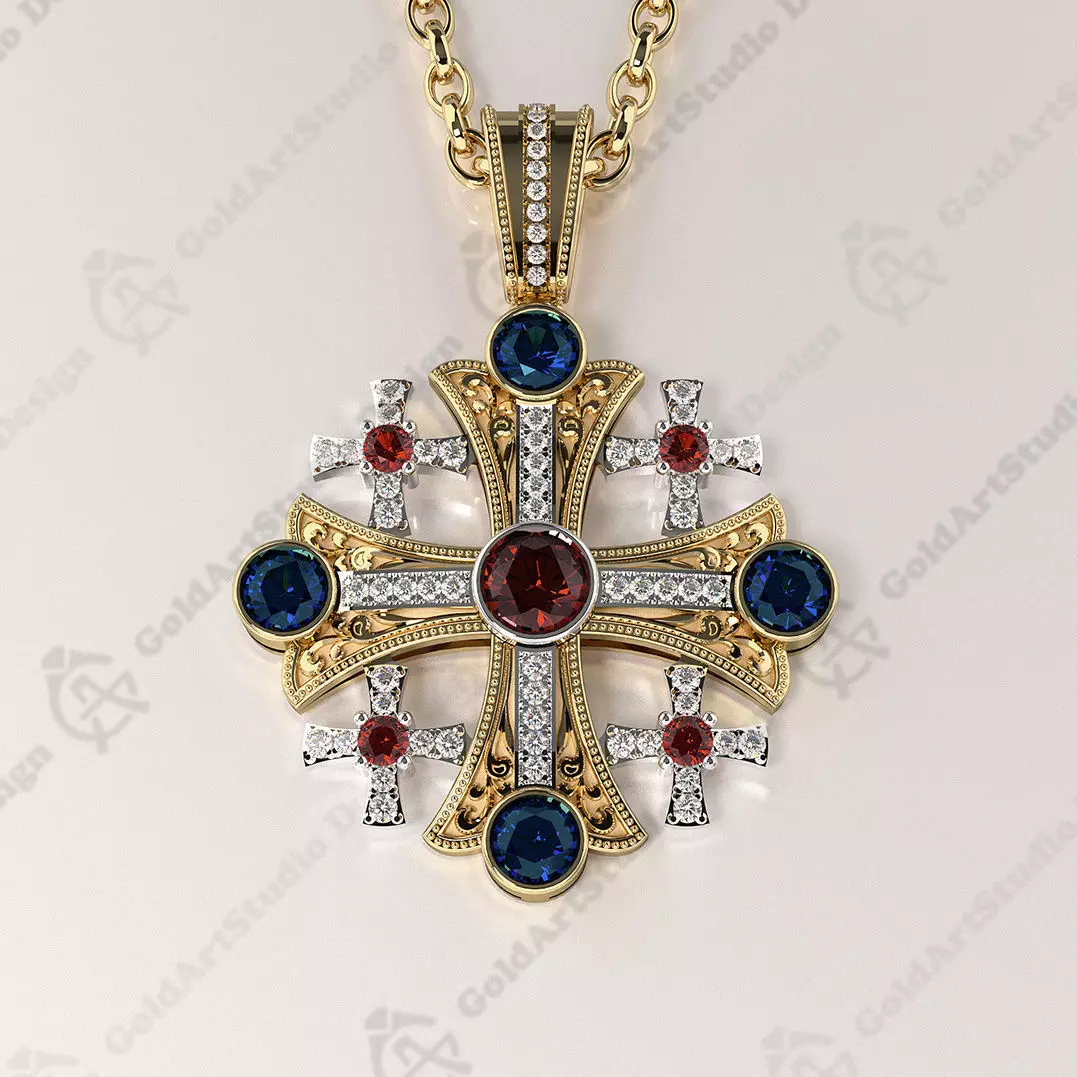 I present the model - Jerusalem Cross Pendant with round gemstones. The model is made by a professional jeweller and meets all production requirements necessary for further production. All dimensions shown in the preview files are the actual dimensions of the model and do not include the percentage of shrinkage for casting.