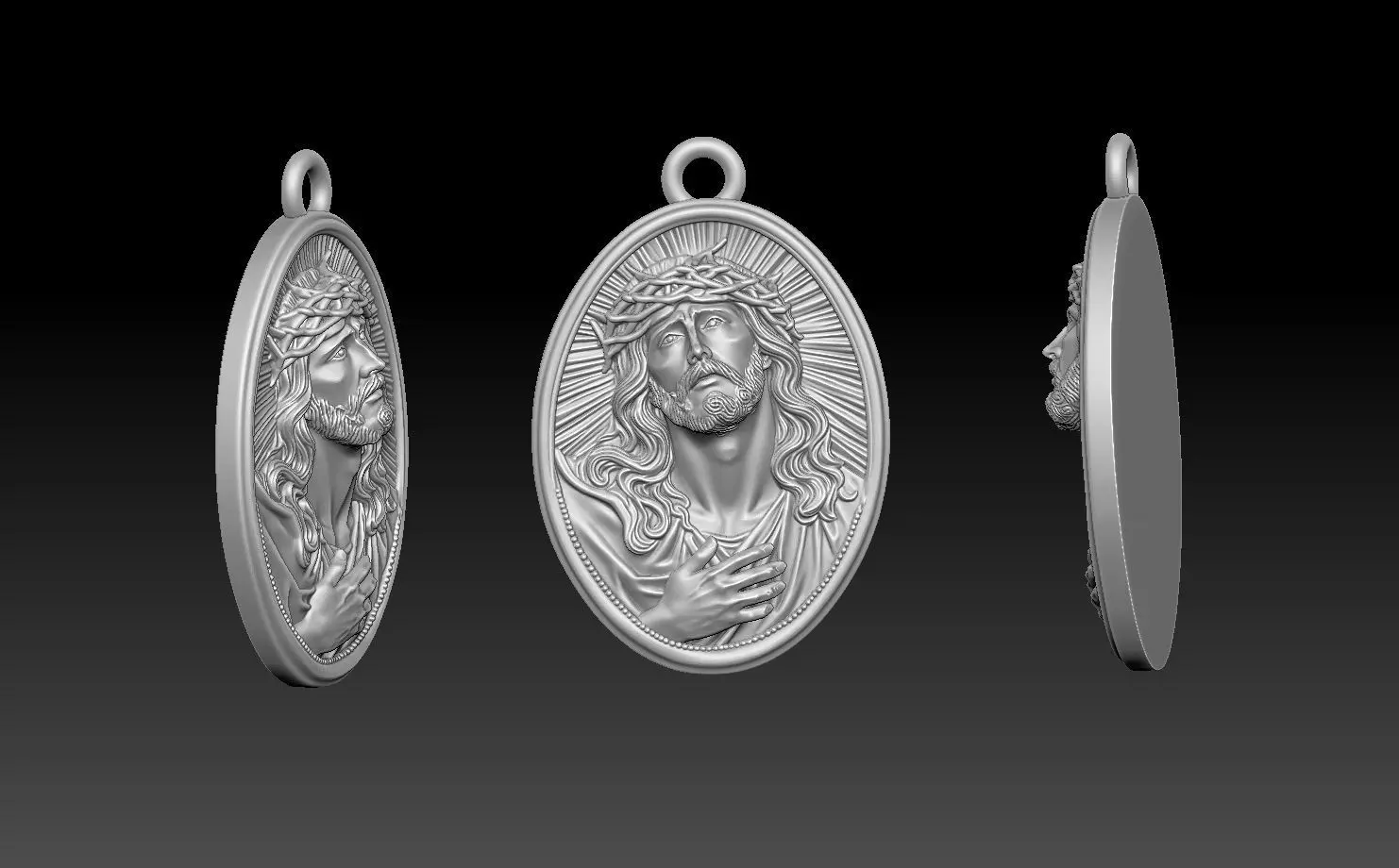 This image shows several views of a 3D digital model for a religious jewelry pendant featuring Jesus Christ wearing the Crown of Thorns. This digital asset is primarily intended for manufacturing purposes through 3D printing, CNC machining, or jewelry casting to create physical medallions in precious metals like sterling silver or gold.DescriptionThe model is an oval medallion featuring a highly detailed bas-relief (high-relief) of Jesus Christ.Central Imagery: Jesus is depicted in a traditional pose of devotion, with his right hand placed over his heart. He is shown with long, flowing hair and a full beard, wearing the Crown of Thorns, which symbolizes his passion and sacrifice.Artistic Detail: The sculpture exhibits intricate textures in the hair, beard, and the folds of his garment, typically created using digital sculpting software like ZBrush.Multi-Angle Presentation: The image displays the model from three perspectives—a side profile to show relief depth, a direct front view, and a flat back view—to illustrate its volume and readiness for production.Manufacturing and UsageAs a digital file (typically provided in STL or OBJ formats), this model serves as a master design for various applications:3D Printing: Used to create high-detail physical resin or plastic models for prototyping, home altars, or as spiritual gifts.CNC Machining: Used to engrave or carve the likeness into materials such as wood, stone, or metal for decorative wall panels or church decor.Jewelry Making: Scaled down to serve as a mold for casting pendants or medallions in precious metals like 925 sterling silver.