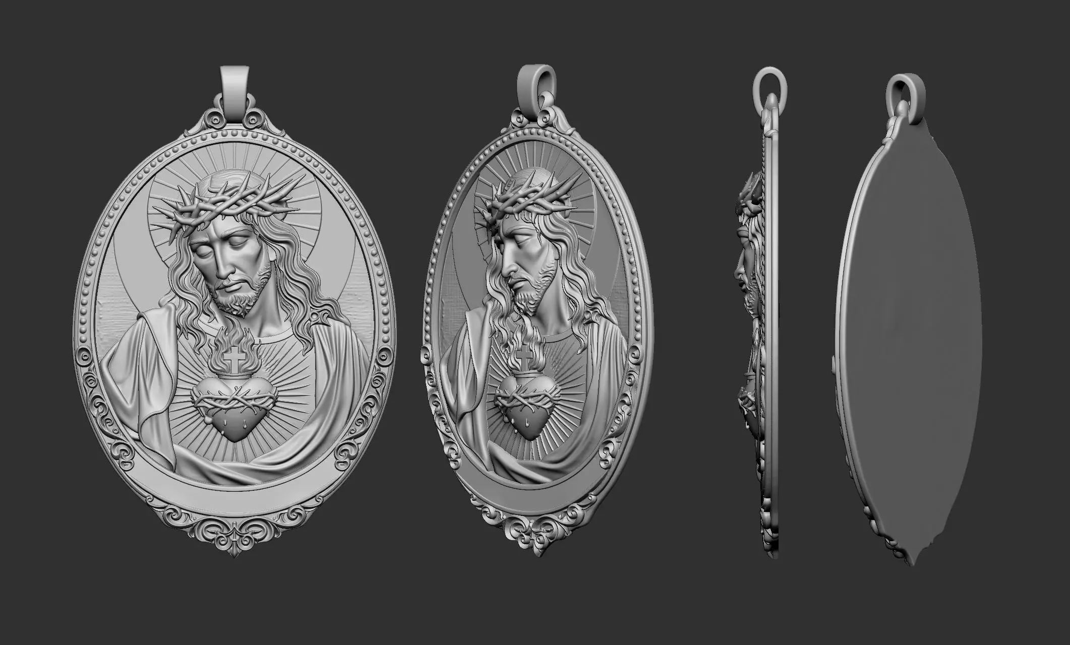 High-detail Jesus Sacred Heart oval medallion pendant designed as a bas-relief jewelry sculpt for 3D printing, casting, and further customization. The model features a devotional portrait of Jesus Christ with crown of thorns, Sacred Heart symbol, halo rays, and ornamental oval frame with bail. Designed in a clean sculptural style with readable relief depth suitable for pendant production workflows. Ideal for jewelers, wax/resin printing, casting prep, and religious jewelry collections.This product is a digital 3D model (not a physical item). Please check dimensions and scale before printing. You can resize to your preferred pendant size in your slicer or CAD software.