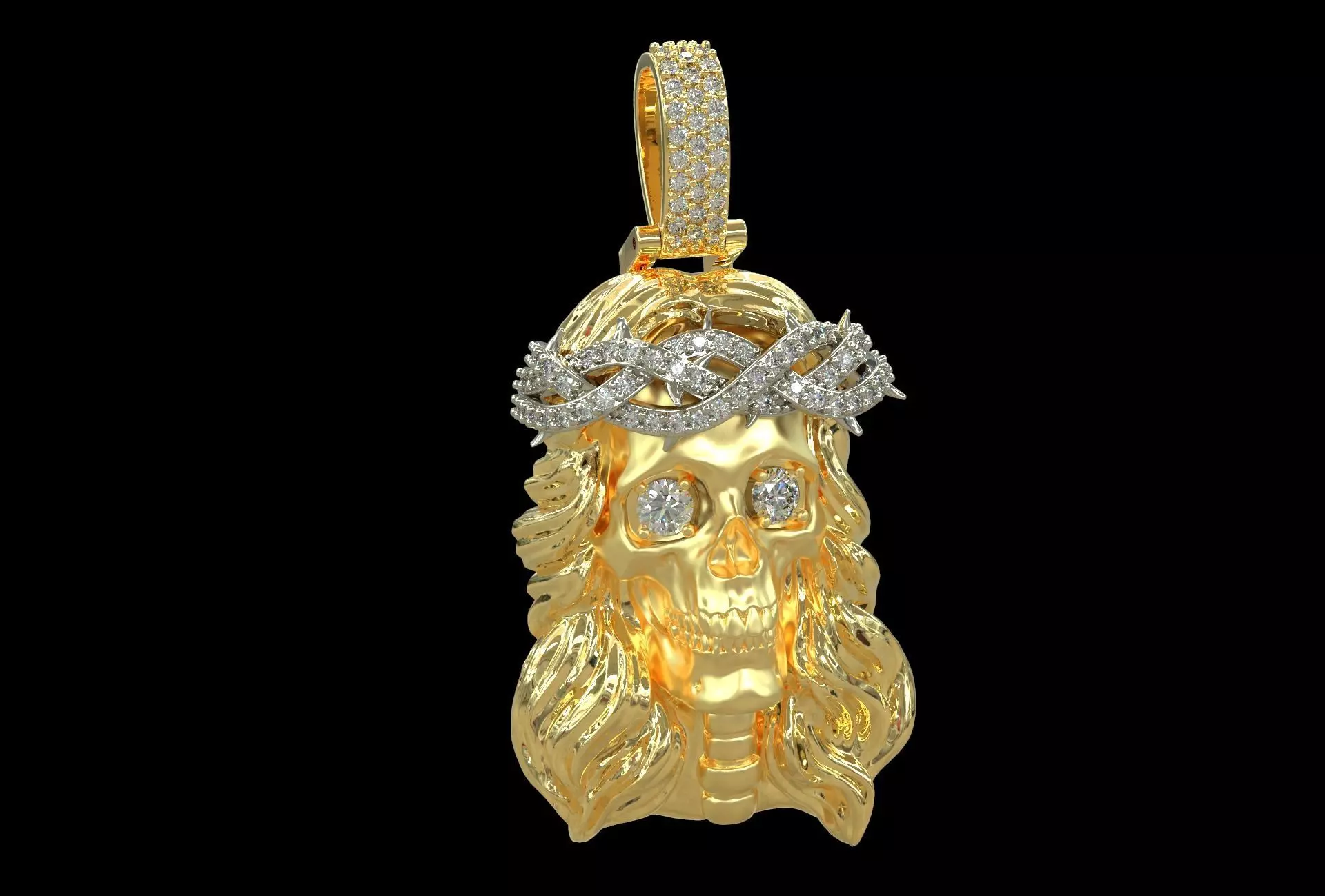 Technical Summary of a 3D-Modeled Skull PendantThis document provides a technical overview of a 3D-modeled pendant, featuring a skull wearing a crown of thorns, designed for jewelry production.
