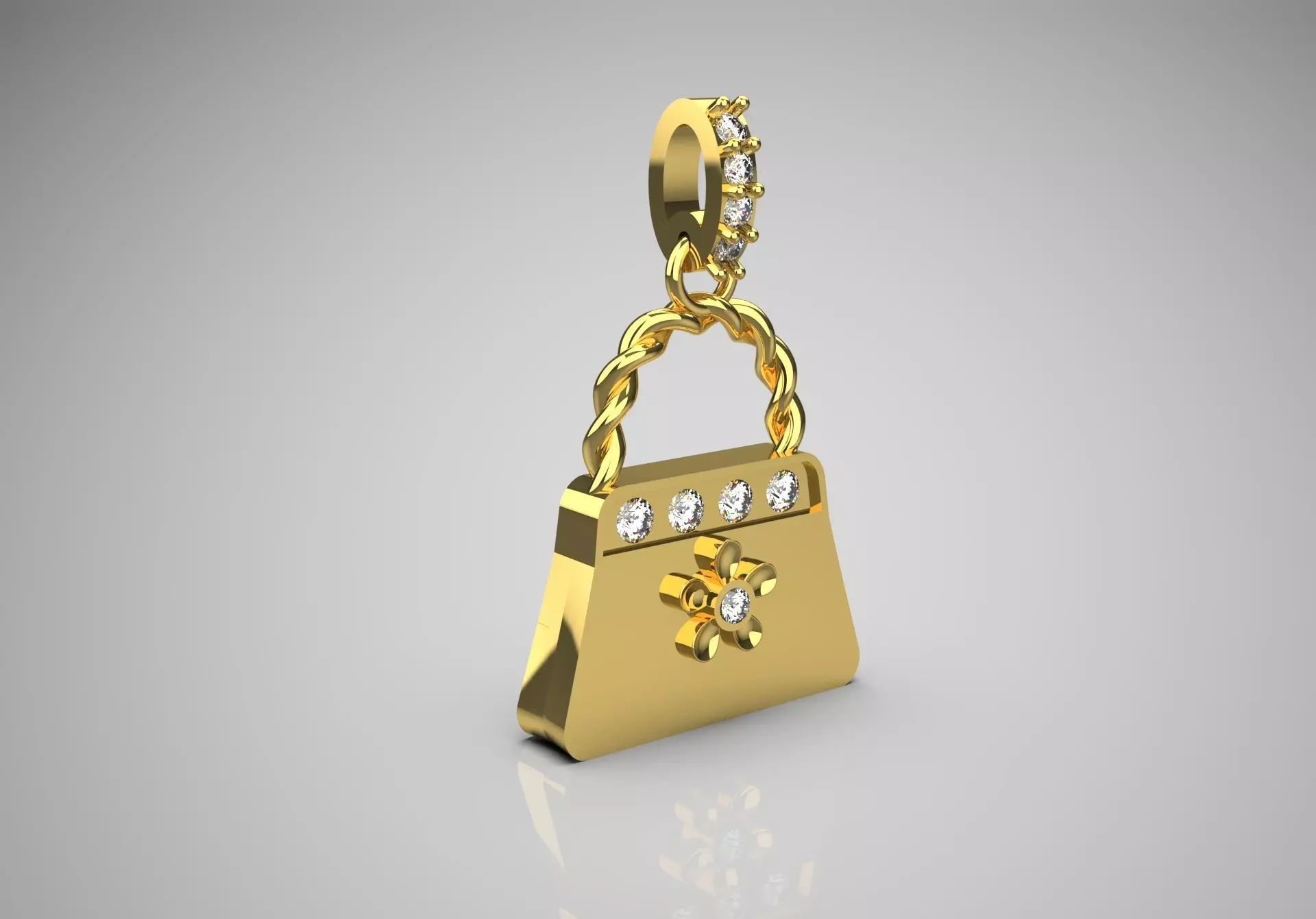 This pendant features an attractive handbag design crafted from shiny yellow gold. The body of the bag is sleek and slightly angular, echoing the shape of a classic handbag. It is adorned with five sparkling diamonds set on the front, reminiscent of decorative studs. A small floral motif centered on the bag, with a jewel at its center, adds a feminine touch. The handle is crafted in a twisted style that enhances the elegance of the piece. This eye-catching pendant beautifully combines whimsy and subtle luxury, making it a stylish accessory for any outfit.