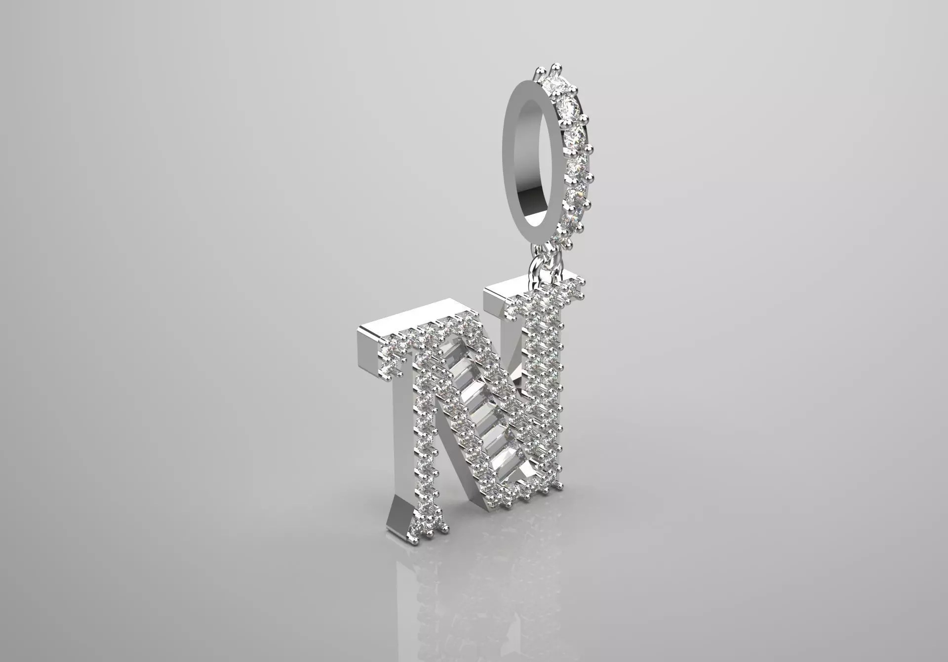This image features a striking pendant in the shape of the letter “N”. This pendant is beautifully designed with a sleek and modern look, crafted from white gold or silver or platinum with a polished finish. It is set with a collection of sparkling diamond gemstones, arranged on the sides and inside corners, creating a stunning effect.
