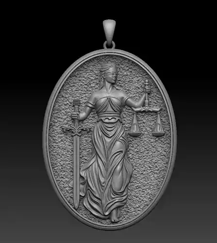 This is a high-detail oval Lady Justice pendant 3D model, featuring a fully sculpted classical female figure holding scales, set on a textured background with a clean oval frame.The composition delivers a strong symbolic presence, refined anatomy, and deep relief suitable for premium jewelry production.