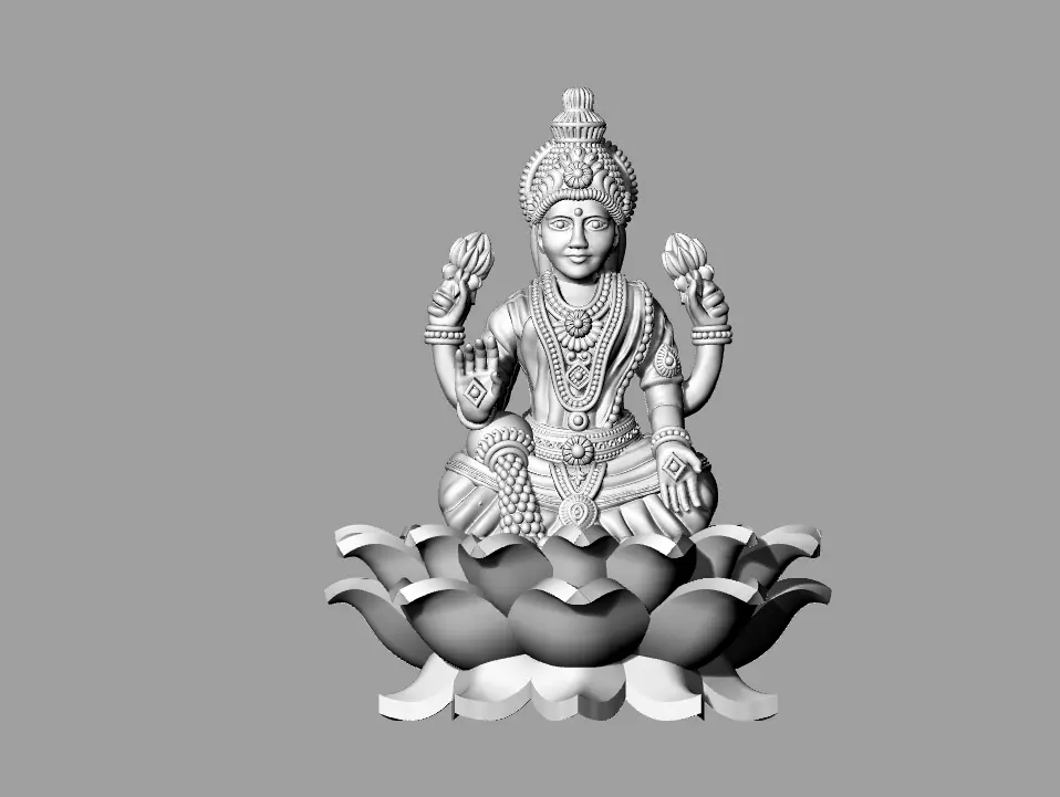 This is a high-quality 3D model of Goddess Lakshmi, beautifully seated on a fully detailed lotus pedestal. The model is designed with fine ornamental detailing, balanced proportions, and smooth surface flow, making it ideal for jewelry CAD, religious artifacts, CNC carving, resin printing, and decorative 3D printing projects.