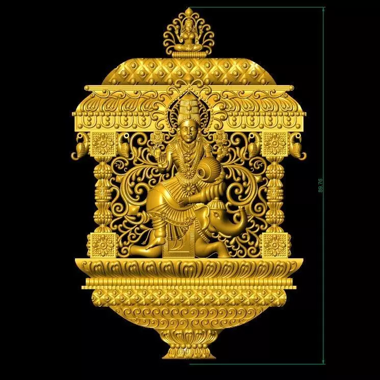 This CAD file represents an intricately designed ornamental sculpture featuring a deity seated on a platform supported by an elaborately carved pedestal. The sculpture showcases the deity adorned with traditional ornaments and garments, holding symbolic items in multiple hands. The platform is flanked by ornate columns and intricate patterns, adding to the grandeur of the design. The entire piece is topped with a decorative canopy that is richly detailed with traditional motifs. The dimensions of the sculpture are marked on the right side of the image, providing a clear reference for its size. This detailed CAD design is likely intended for use in religious or cultural settings, reflecting the artistry and craftsmanship of traditional design.