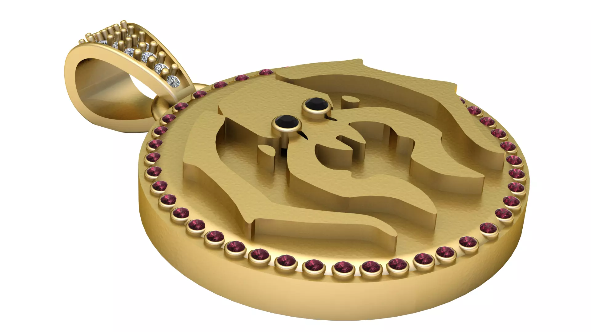 This sophisticated 3D printable gold pendant features a powerful abstract lion or beast face design, radiating strength and confidence. The raised design forms a bold silhouette with smooth flowing lines, accented by two striking black gemstones as eyes, giving the piece a captivating focal point. A beautiful border of deep red gemstones encircles the pendant, enhancing its richness and luxury. The bail is finely adorned with sparkling diamonds, adding an extra touch of brilliance and refinement. This pendant is perfect for custom fine jewelry collections, statement fashion accessories, or meaningful symbolic pieces representing courage and leadership.