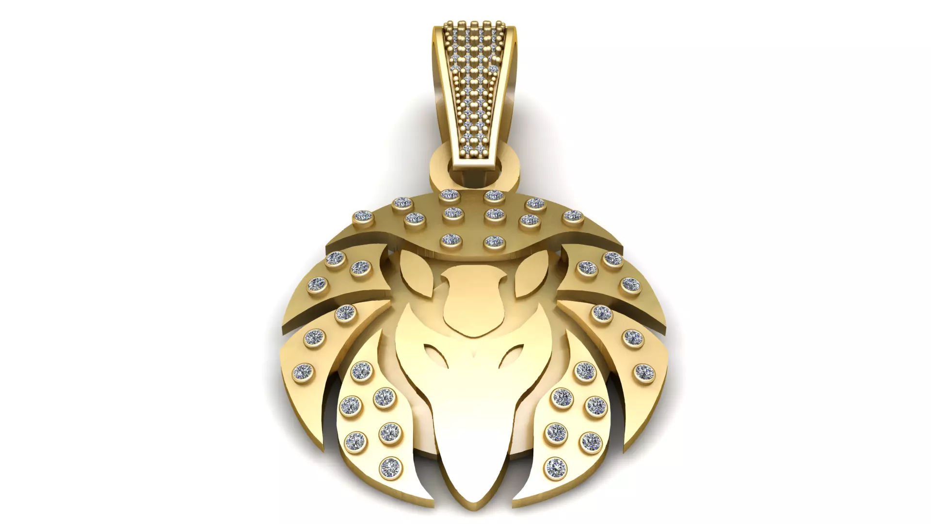 This powerful and majestic pendant showcases a bold lion head motif, intricately sculpted in rich yellow gold. The design captures the essence of strength and nobility, with sharply contoured features that form the lion’s mane and face in a stylized, artistic layout. Each segment of the mane is adorned with meticulously set round-cut white stones, adding a touch of brilliance and luxury to the fierce design. The highly detailed bail is encrusted with multiple rows of sparkling stones, completing the regal look. A striking symbol of courage and leadership, this pendant is perfect for those who embody confidence and elegance.