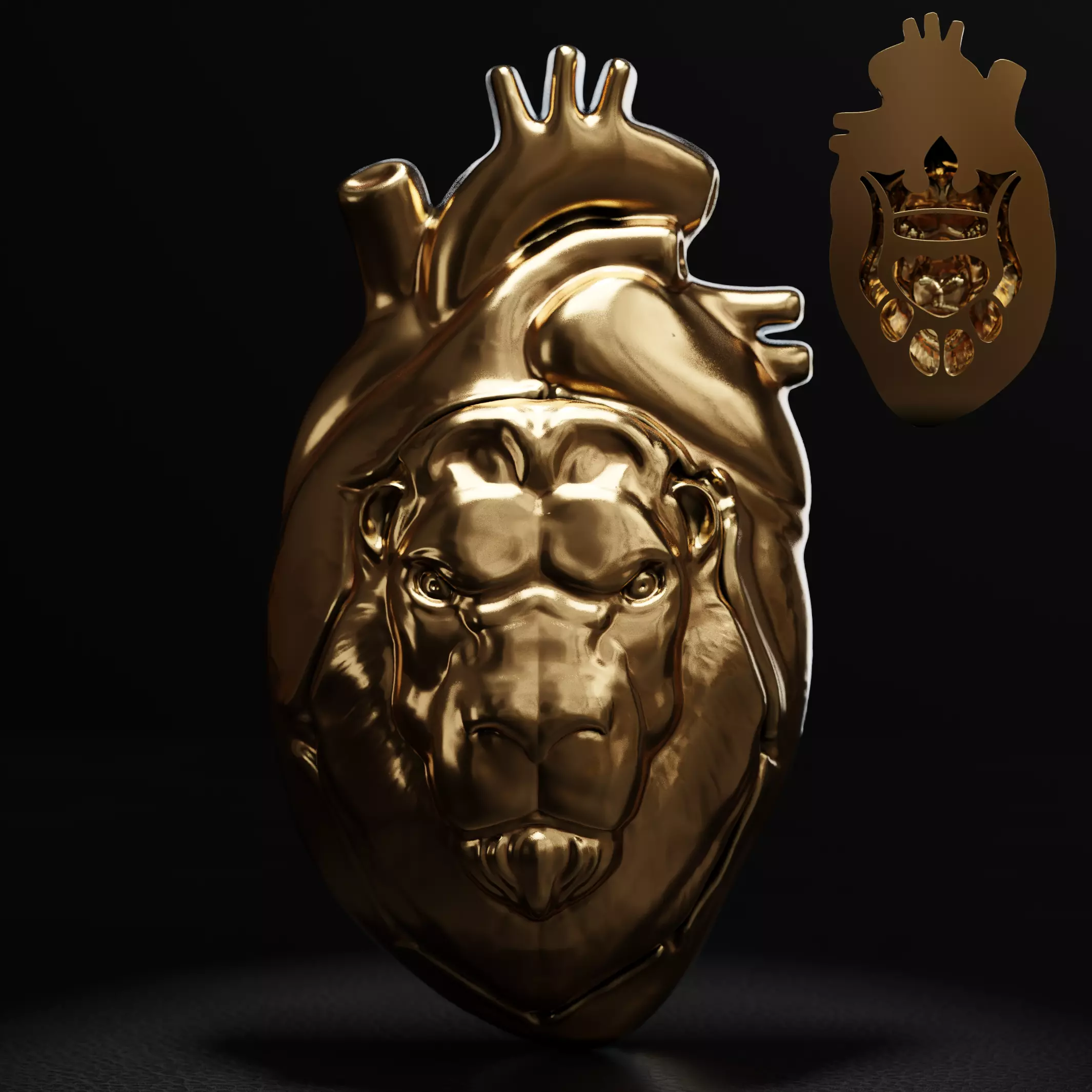 Lion head emerging from the heart - 3D printable STL pendant. Bring power, symbolism, and luxury to your jewelry collection with this highly detailed lion head heart pendant STL model, created for professional casting and custom jewelry production.This bold heart pendant features a sculpted lion head emerging from the heart, combining emotion with strength in one striking design. The powerful composition symbolizes courage, bravery, leadership, resilience, and fearless spirit.Designed as a premium statement pendant, this model is ideal for jewelers and manufacturers producing custom gold pendants, men’s jewelry, luxury necklaces, or symbolic collections.