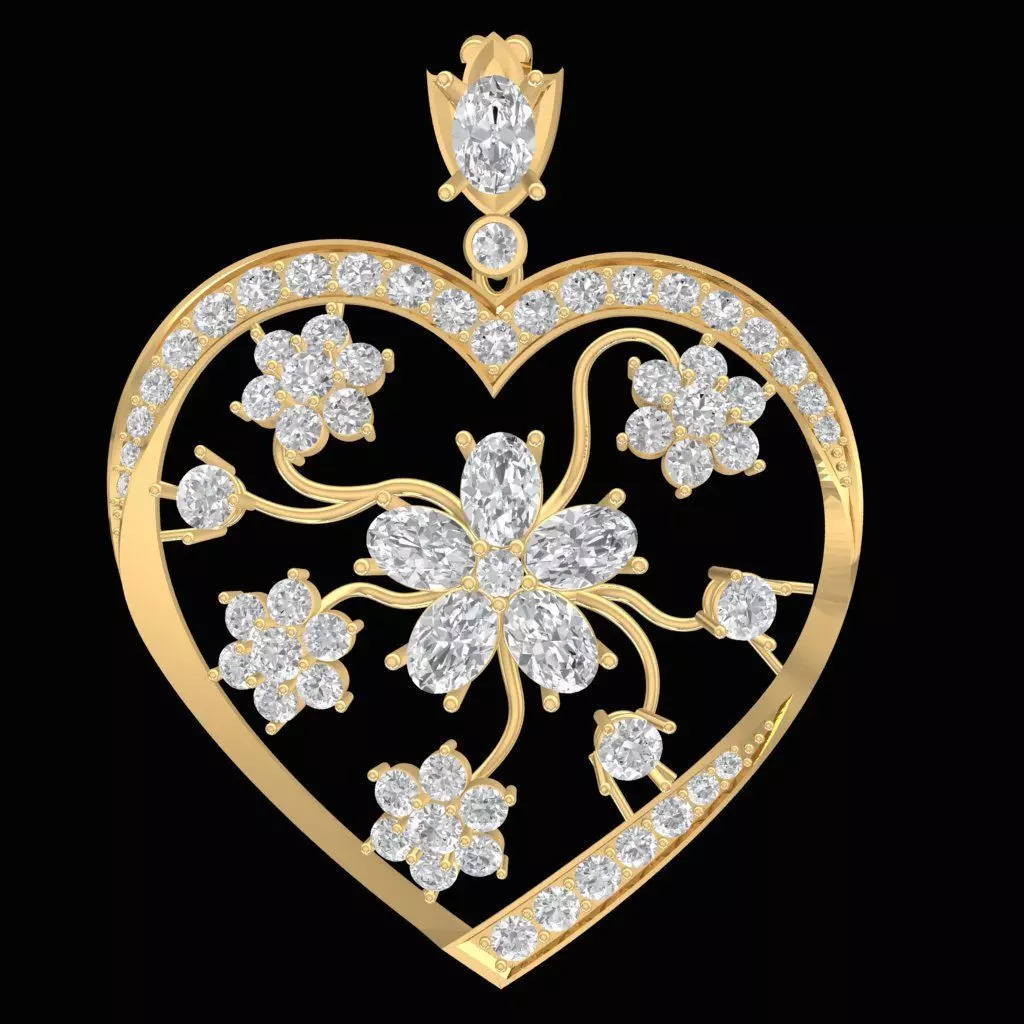 This luxury heart flower diamond pendant 3D jewelry model features an elegant openwork heart frame combined with a delicate floral motif. The flowing vine-inspired structure creates a romantic and refined design, highlighting femininity and timeless beauty.