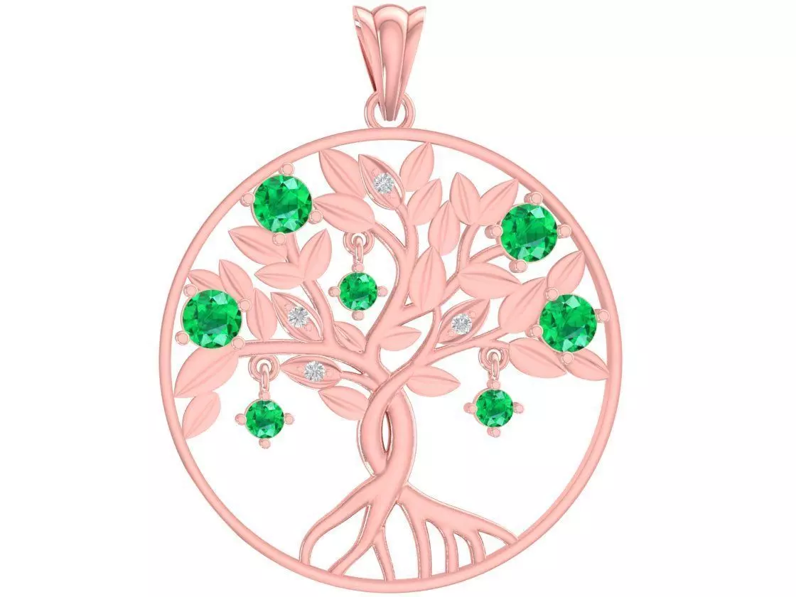 This Tree of Life round pendant 3D jewelry model features a classic circular frame with an organic tree design and gemstone-set leaves. The balanced branches and rooted trunk symbolize growth, harmony, and prosperity, making the design timeless and meaningful.